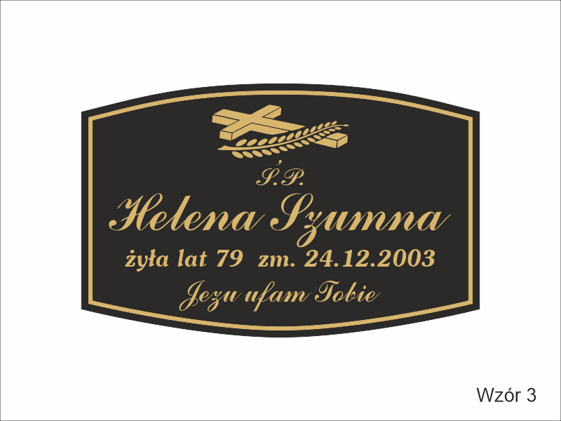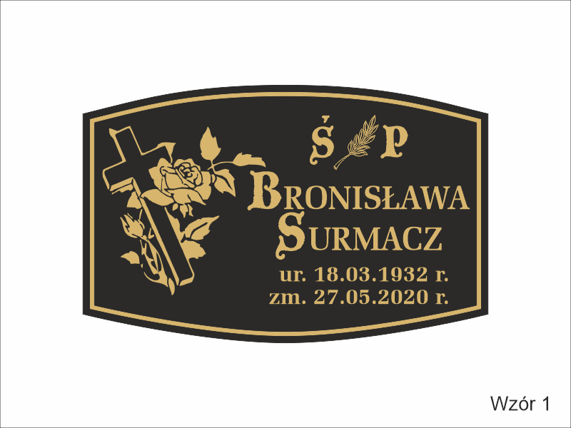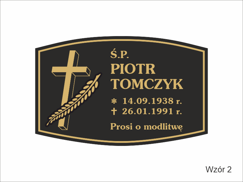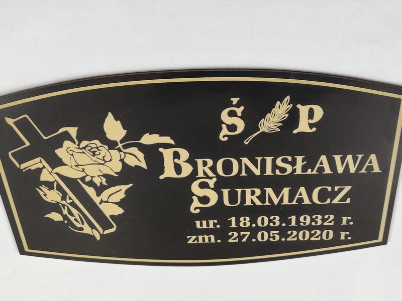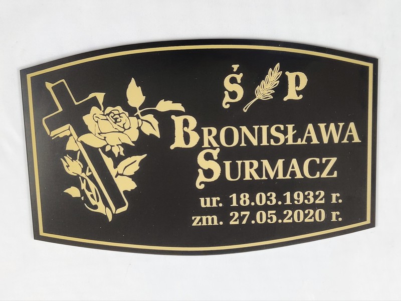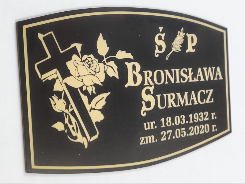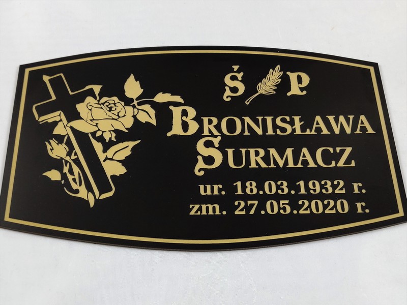 Tabliczka nagrobkowa grawerowana, wykonana z laminatu grawerskiego o nieregularnym kształcie.