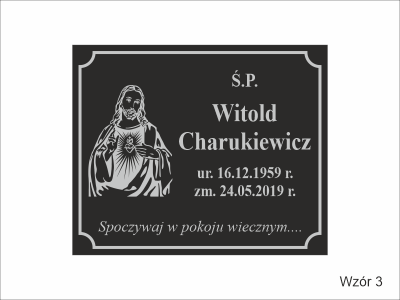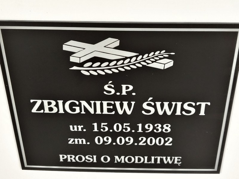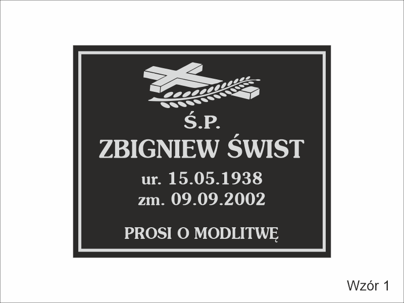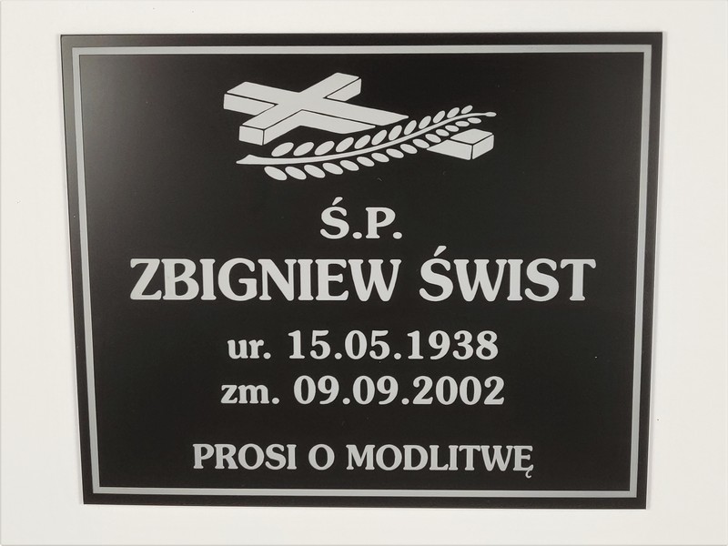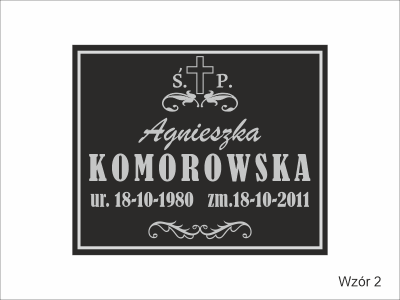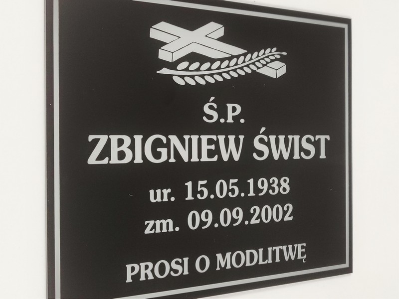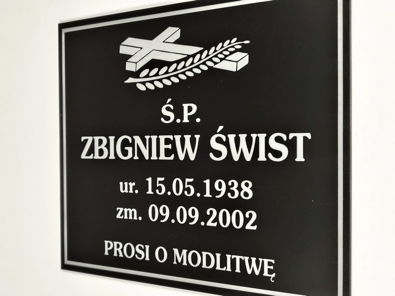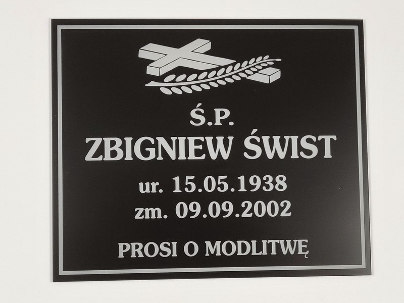 Tabliczka nagrobkowa grawerowana, wykonana z laminatu grawerskiego w prostokątnym kształcie.