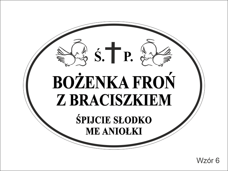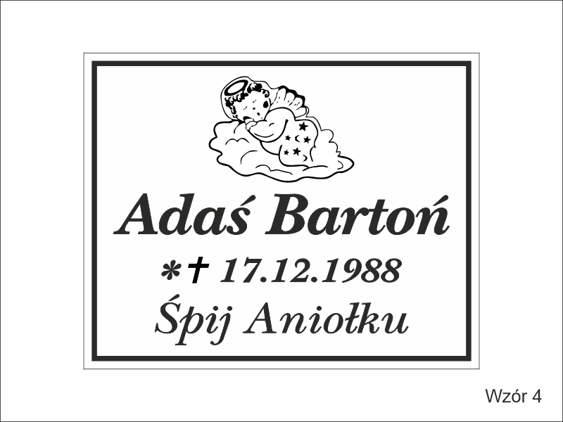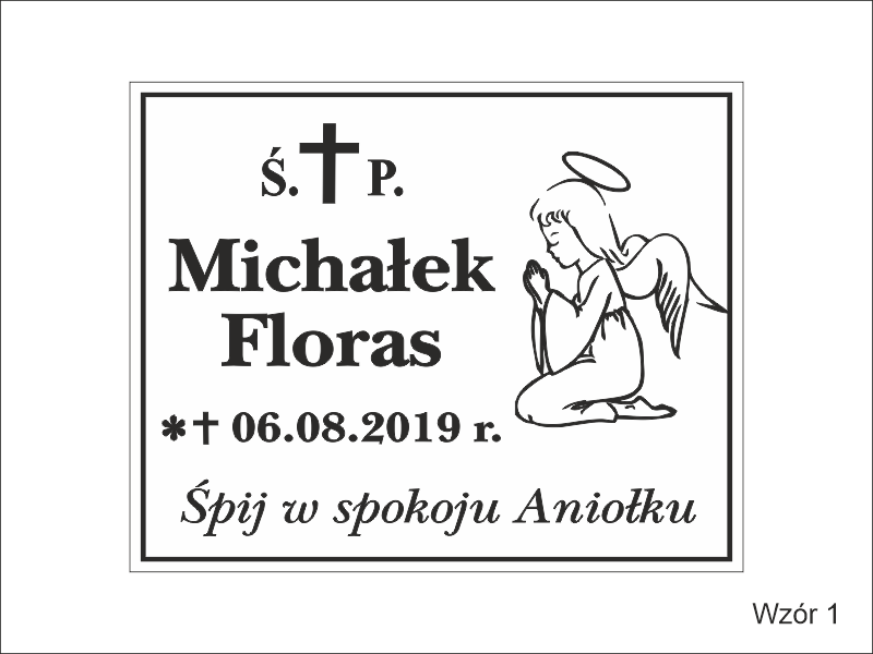 Tabliczka dostępna jest w różnych rozmiarach. W projekcie tabliczki wyeksponowany jest wizerunek aniołka.
