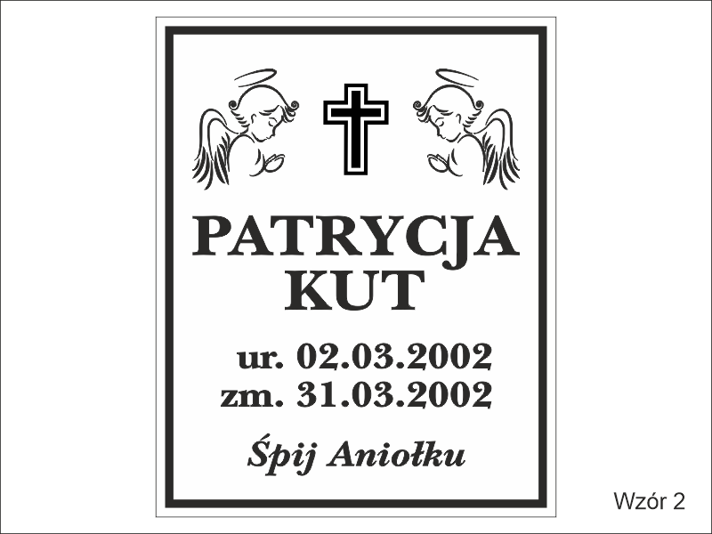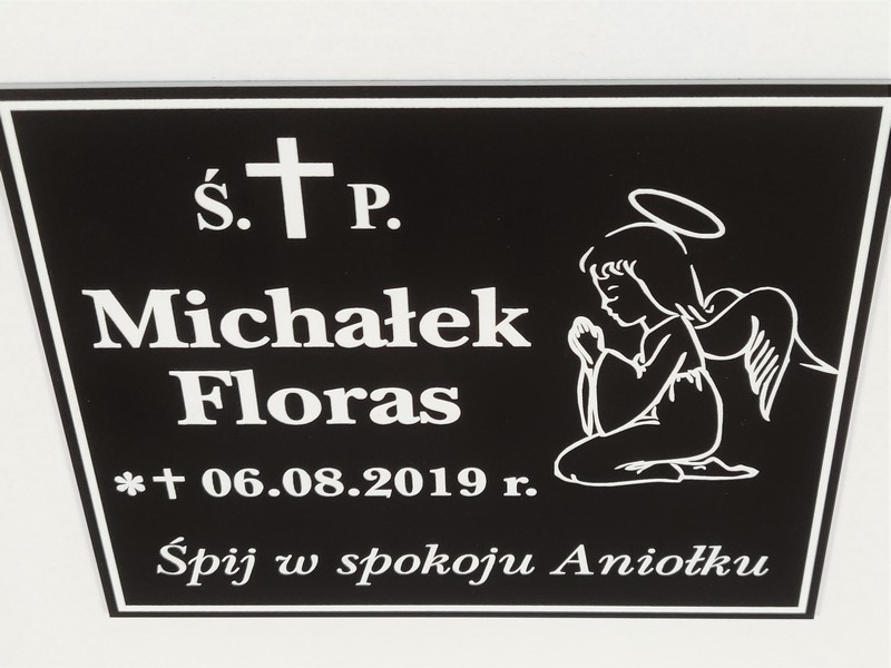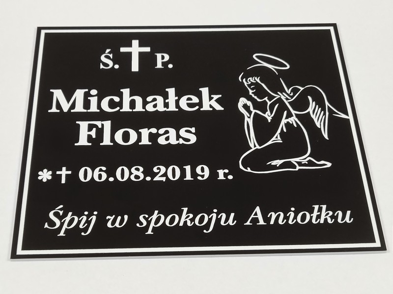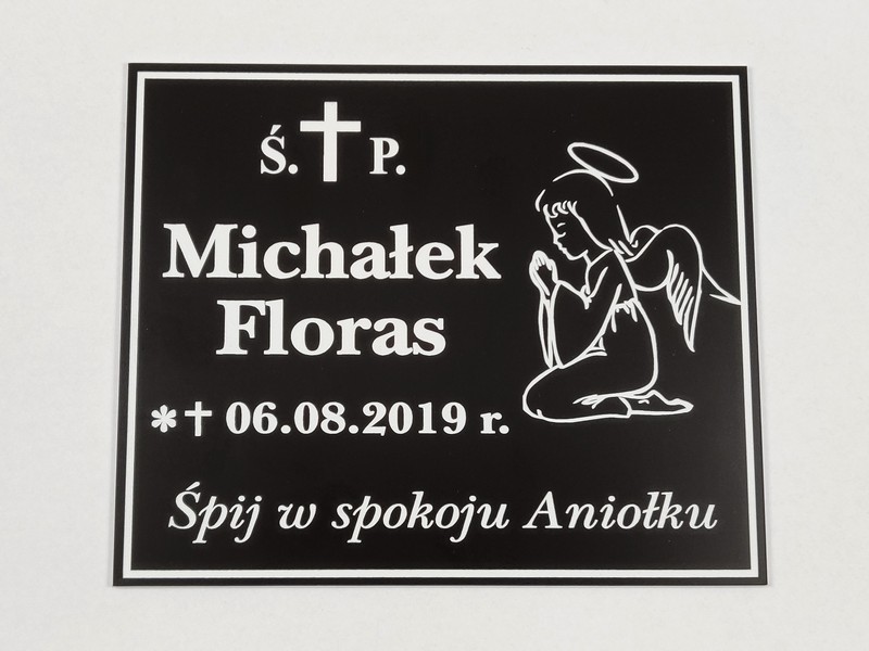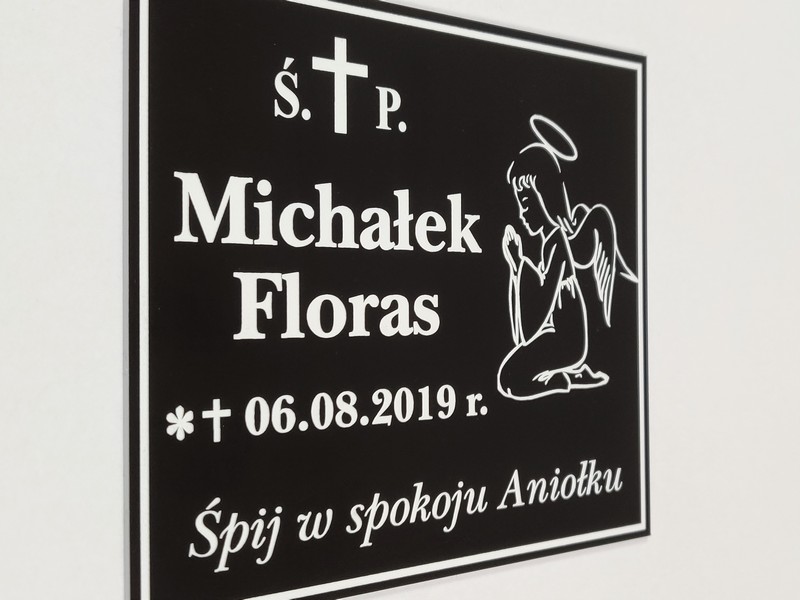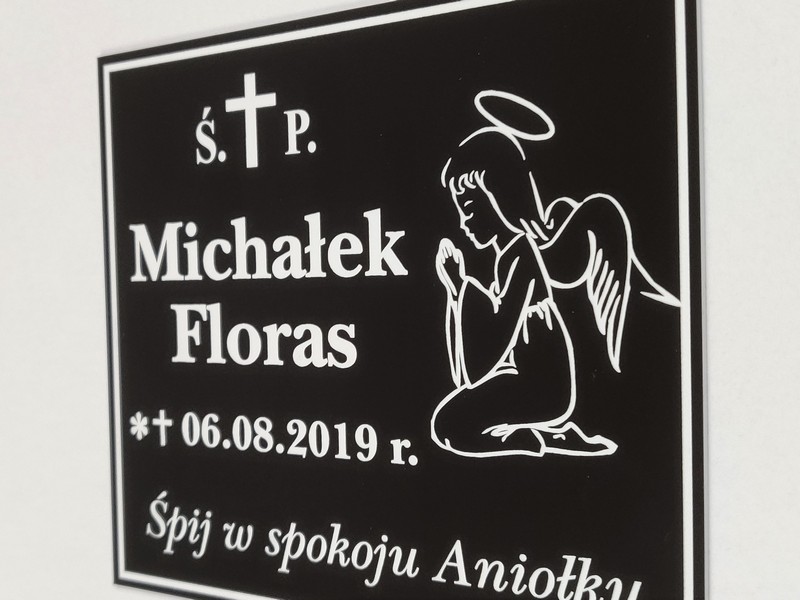 Tabliczka nagrobkowa grawerowana, wykonana z laminatu grawerskiego z Aniołkiem.