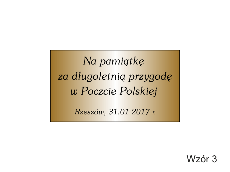 Blacha z której wykonana jest tabliczka występuje w kolorystyce: jasno-złotej, ciemno-złotej, srebrnej, satynowej, brązowej, białej.