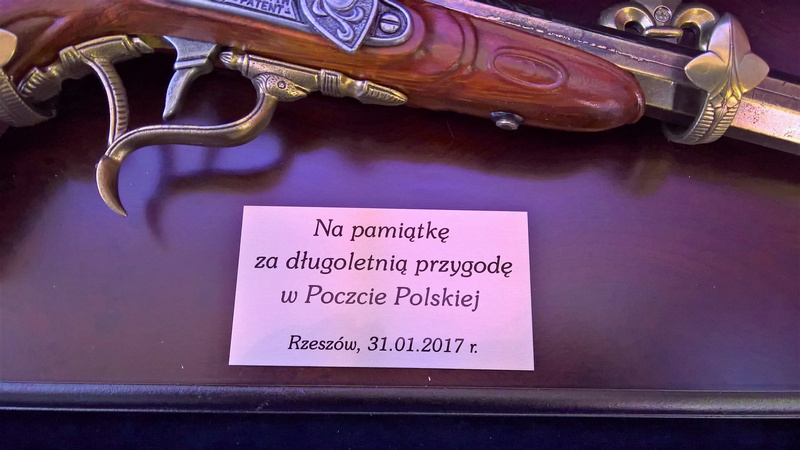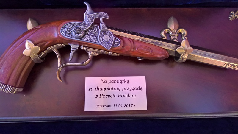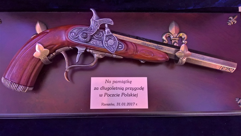 Tabliczka okolicznościowa z pamiątkową dedykacją, mocowana do podkładu drewnianego z pistoletem.