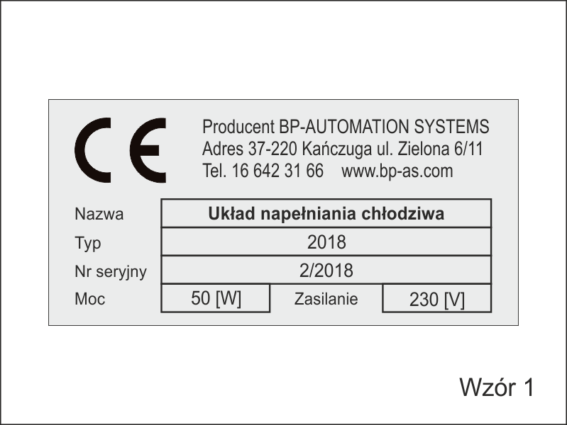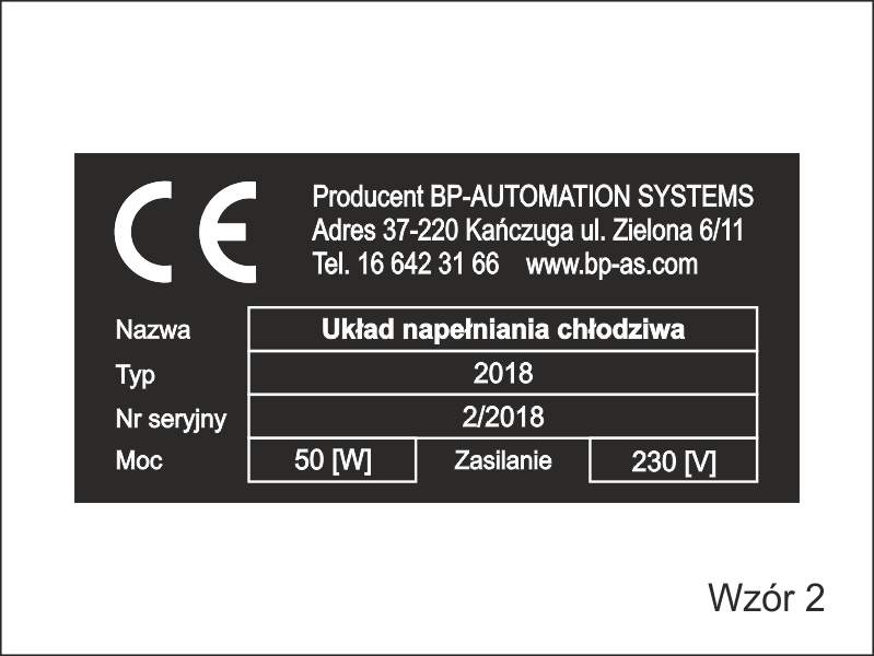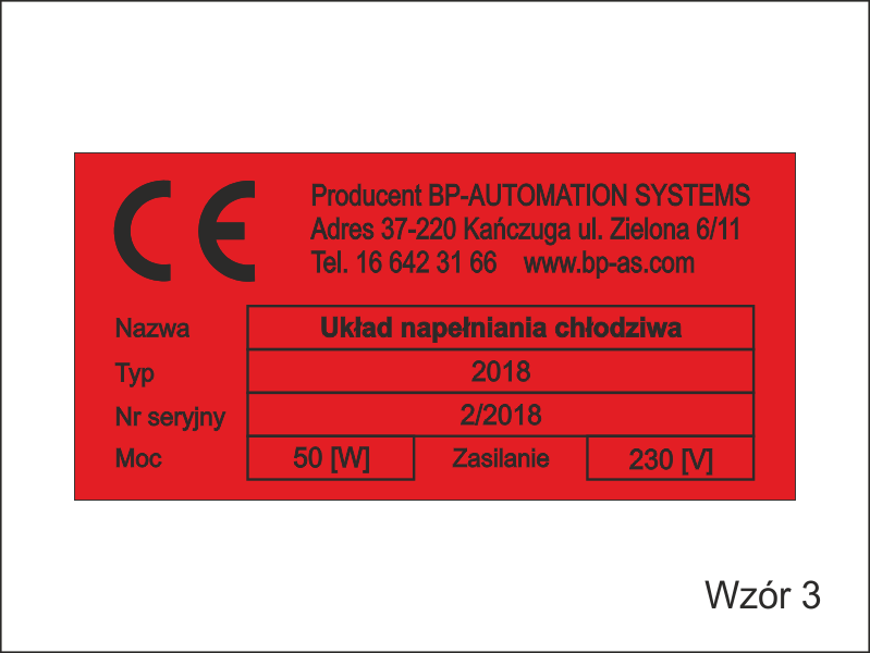 Tabliczka znamionowa może mieć inny dowolny rozmiar i występować w innej kolorystyce (czarno/białej, czerwono/czarnej lub innej)