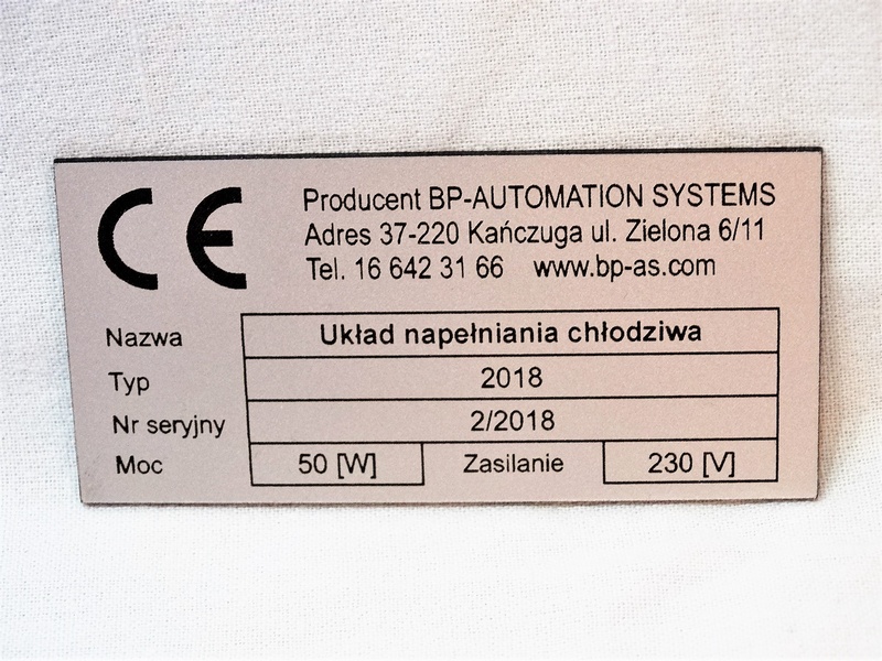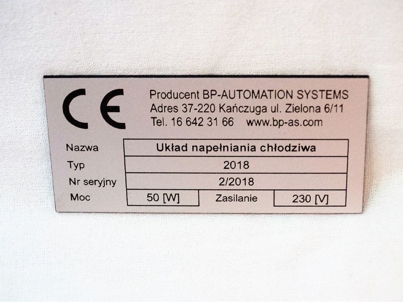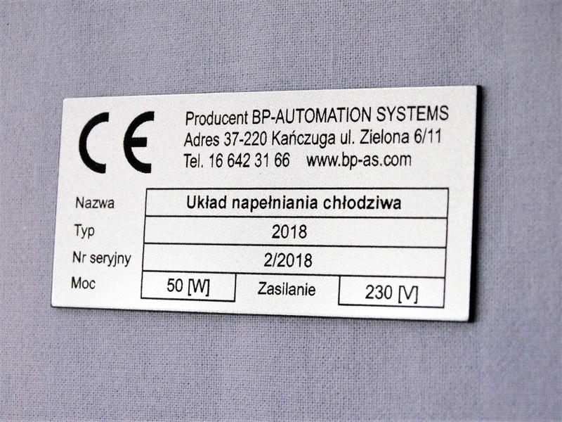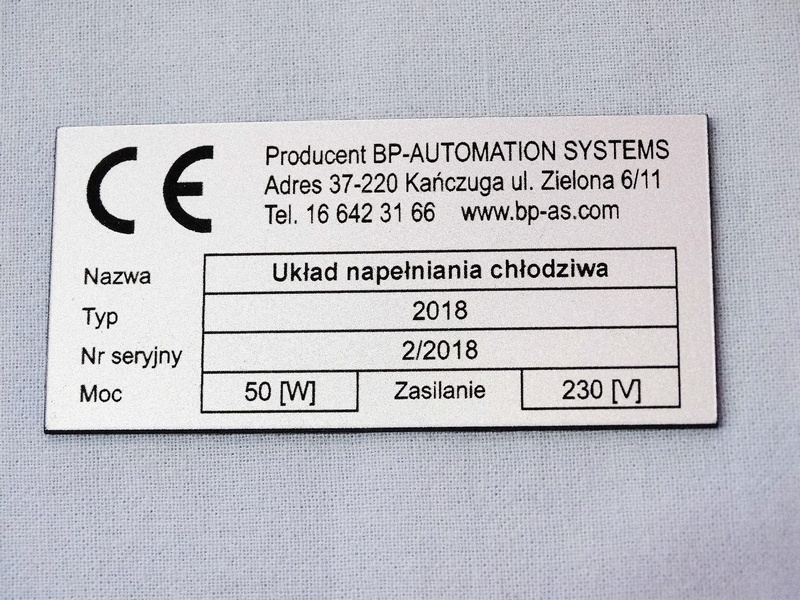 Tabliczka znamionowa ze srebrno/czarnego laminatu grawerskiego w rozmiarze 80 x 40 mm.