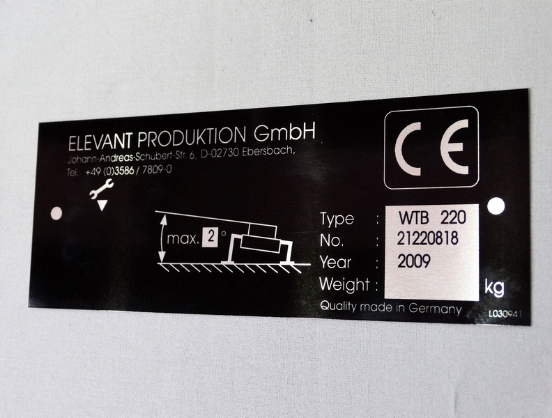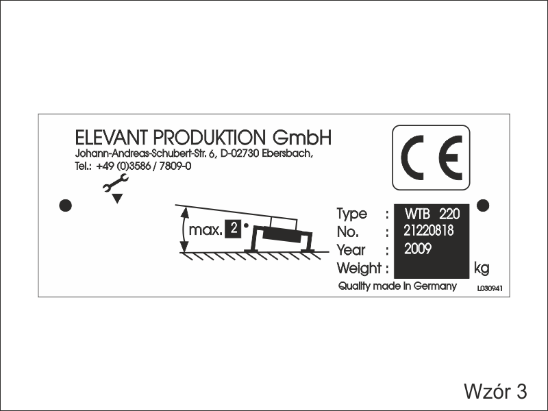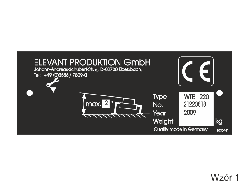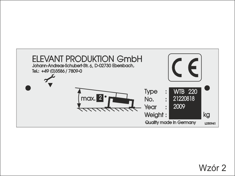 Tabliczka znamionowa może mieć inny dowolny rozmiar i występować w innej kolorystyce (srebrno/czarnej, biało/czarnej lub innej)