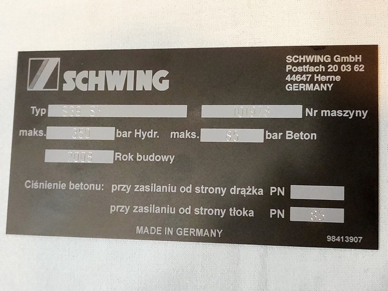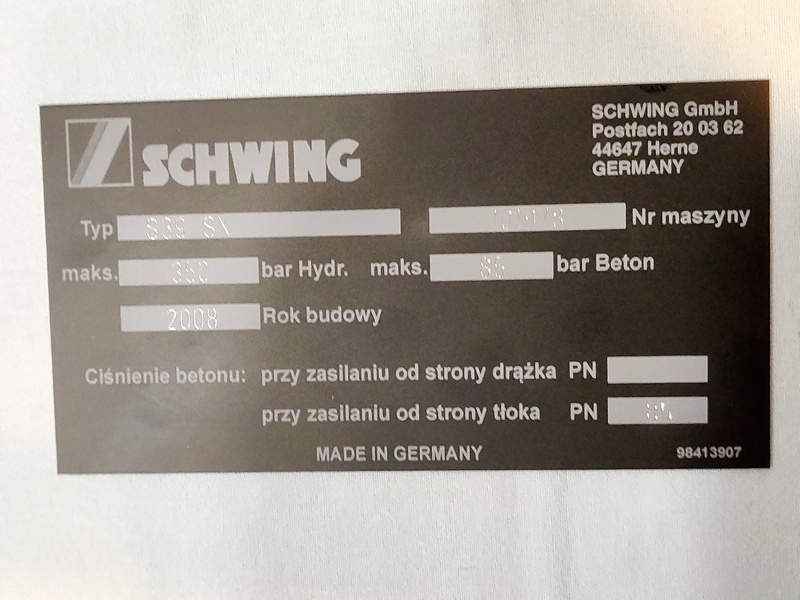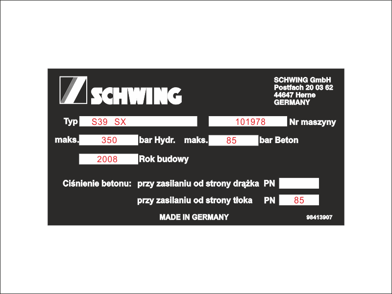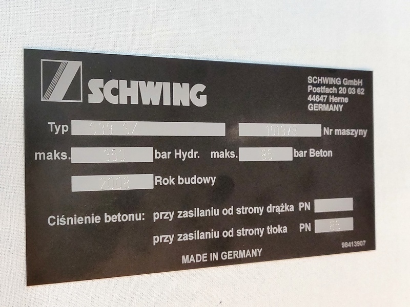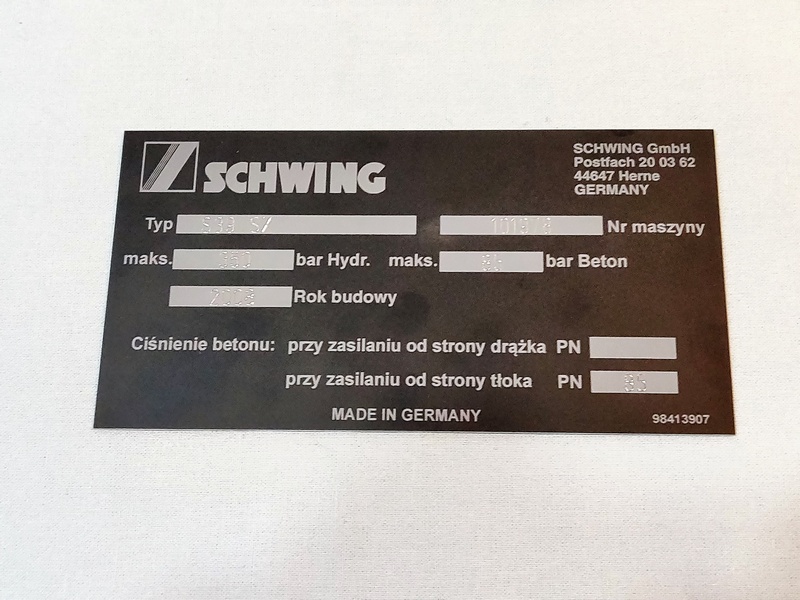 Tabliczka znamionowa Schwing z aluminium anodowanego z grawerem, w rozmiarze 150 x 80 mm.