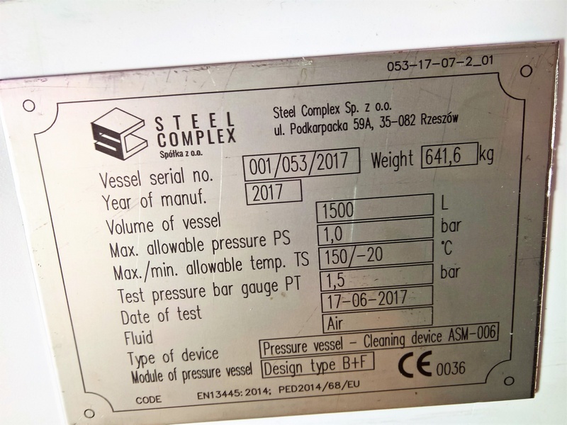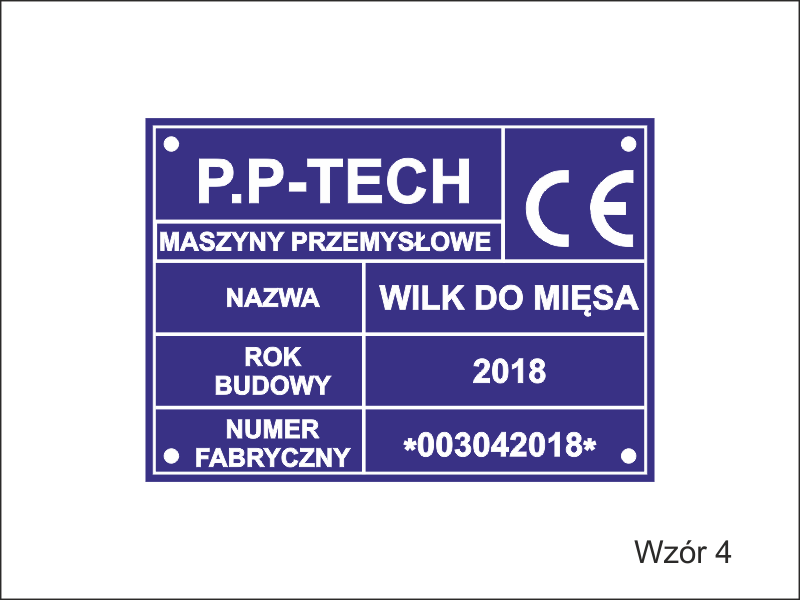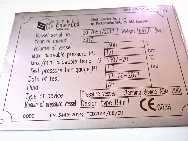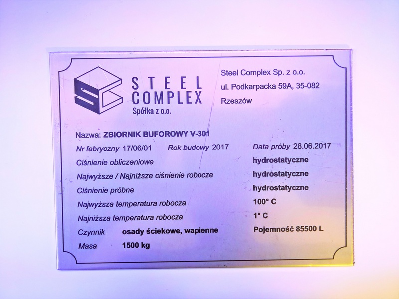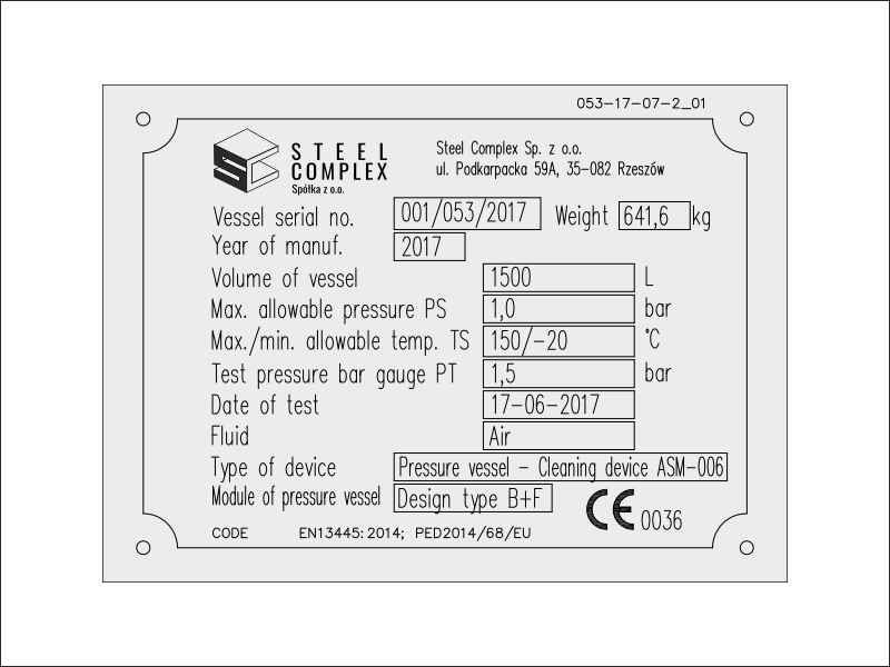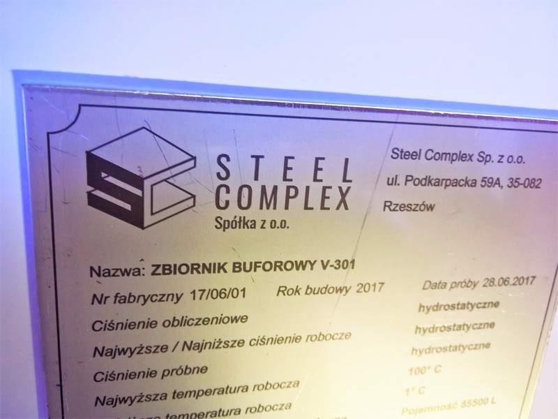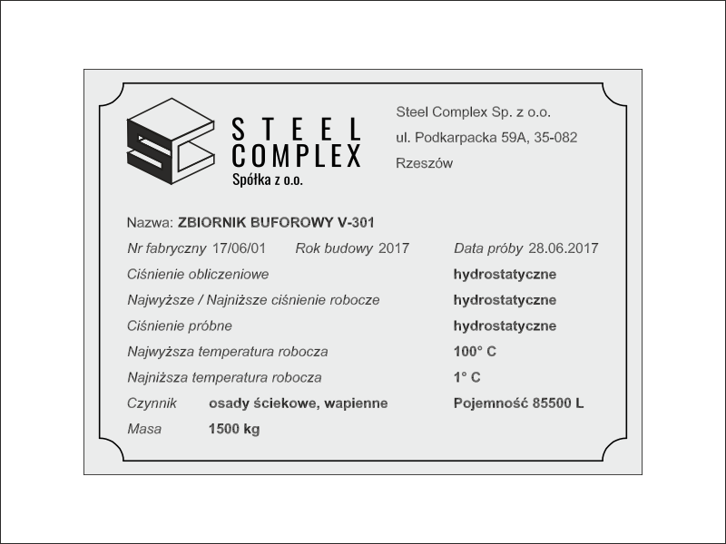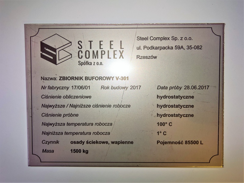 Tabliczka znamionowa wykonana ze stali nierdzewnej w rozmiarze 150 x 110 mm.