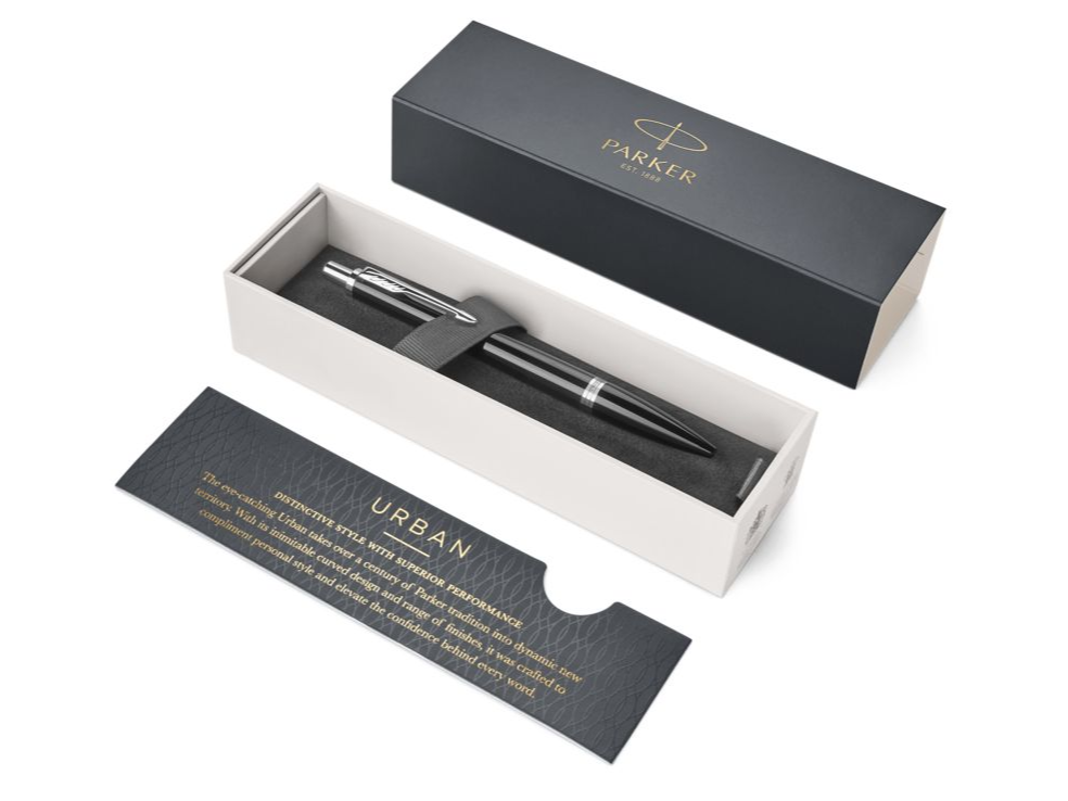 Korpus długopisu Parker Urban Core London Cab Black CT wykonano z mosiądzu pokrytego połyskującym, czarnym lakierem. Sekcja przednia wykonana z połyskującego, czarnego materiału polimerowego. Całość wieńczą pierścienie ze stali nierdzewnej z wykończeniami platerowanymi chromem.