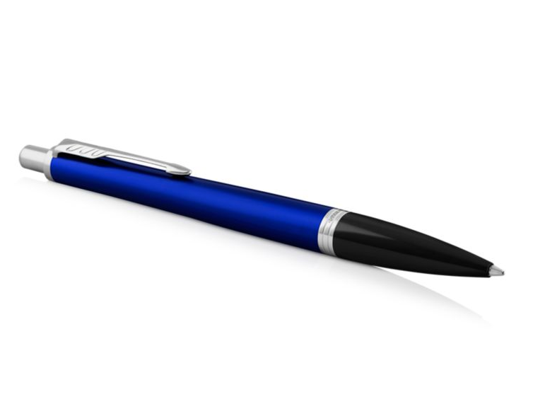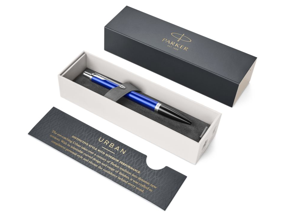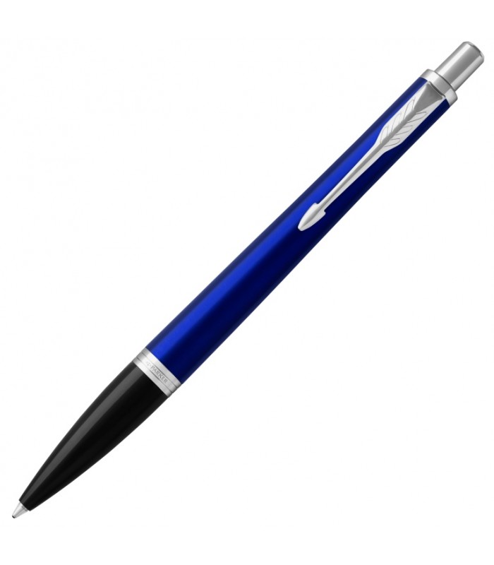 Korpus długopisu Parker Urban Core Night Sky Blue CT wykonano z mosiądzu pokrytego satynowym lakierem w kobaltowym odcieniu. Sekcja przednia wykonana z połyskującego, czarnego materiału polimerowego. Całość wieńczą pierścienie ze stali nierdzewnej z wykończeniami platerowanymi chromem.