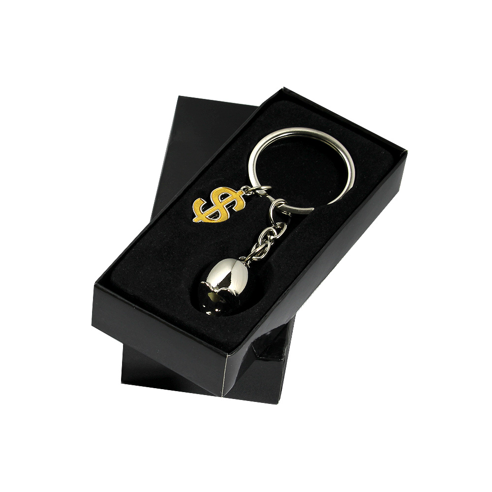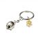 Metalowy podwójny brelok do kluczy w formie świnki i symbolu dolara, zawieszonymi na kółku.