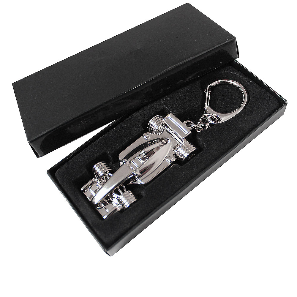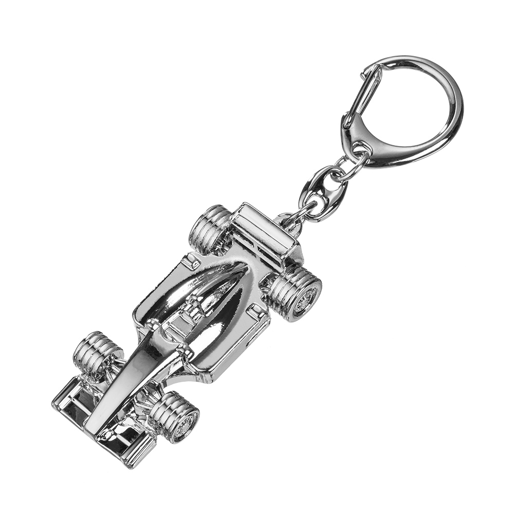 Brelok metalowy w kształcie samochodu wyścigowego z możliwością graweru na przodzie i na odwrocie.
