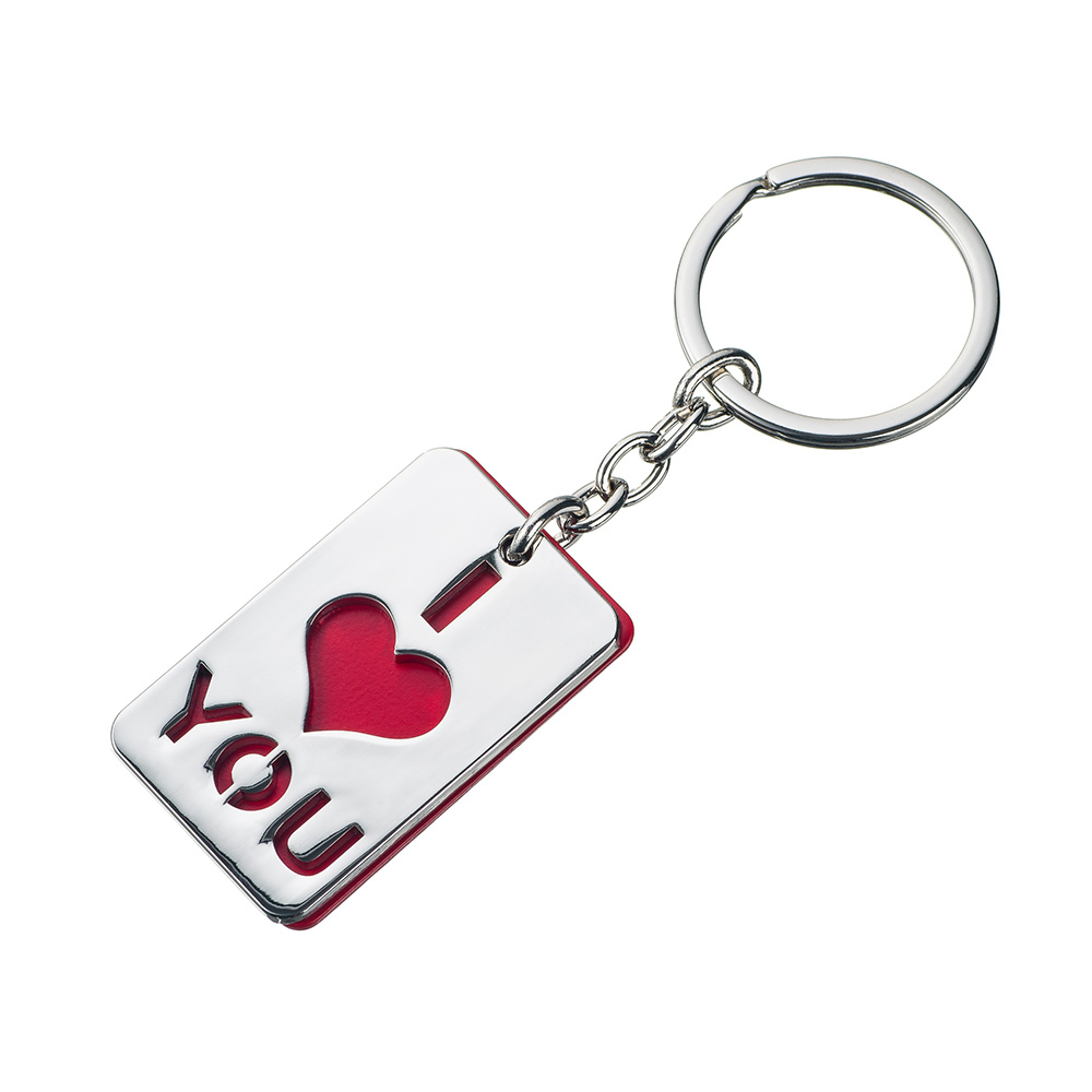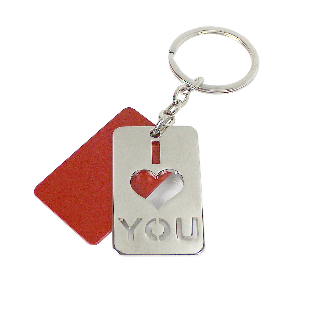 Brelok metalowy składający się z dwóch ruchomych płytek.