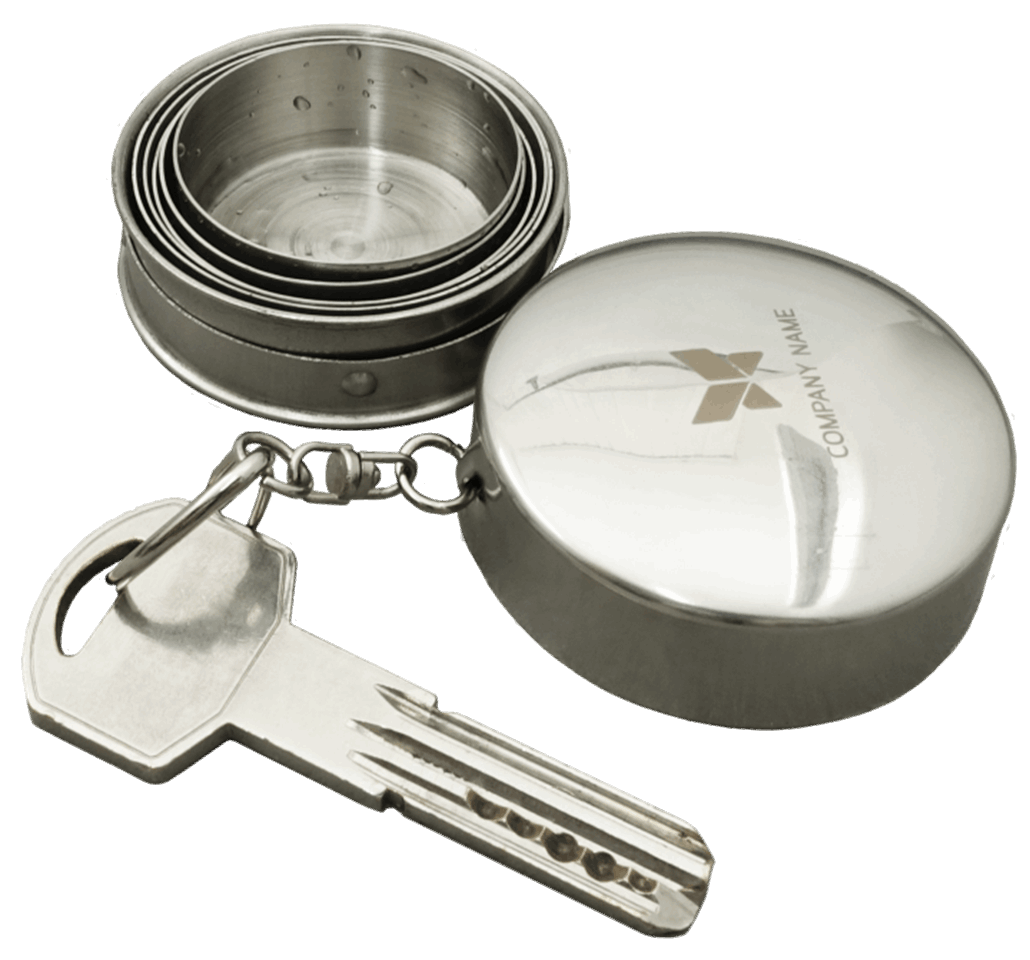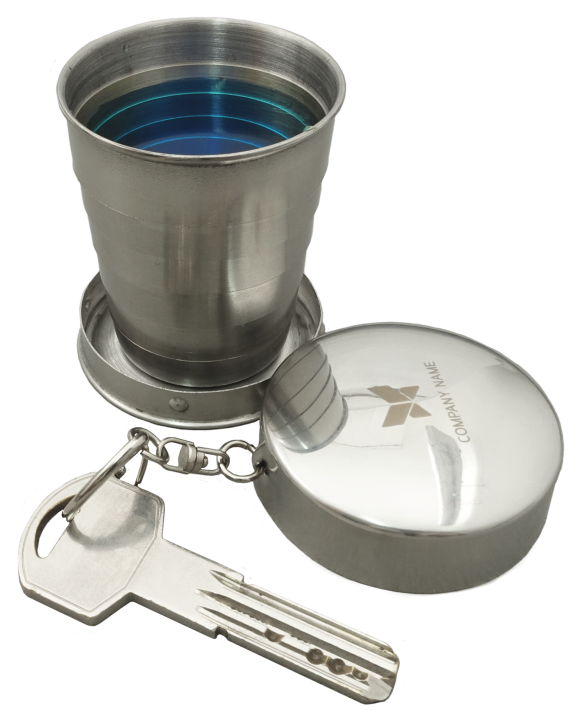 Metalowy brelok do kluczy z funkcją rozkładanego kieliszka.