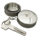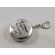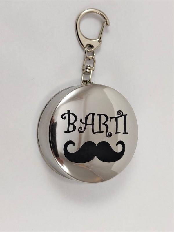 Brelok ma formę metalowej, wykonanej z polerowanej stali nierdzewnej, okrągłej, zamkniętej kasety.
