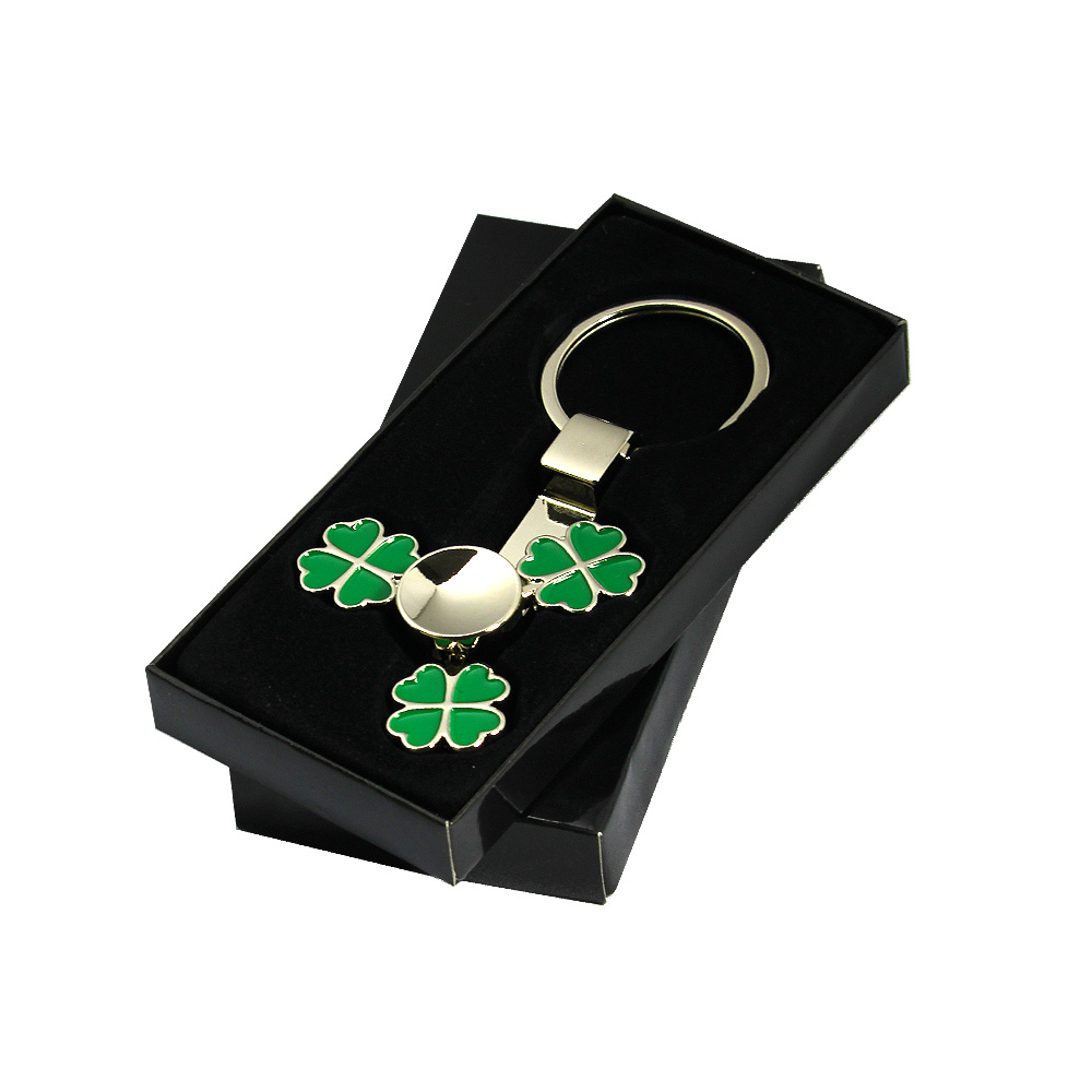 Metalowy brelok do kluczy z trzema zielonymi koniczynkami osadzonymi na obrotowym elemencie typu spinner.