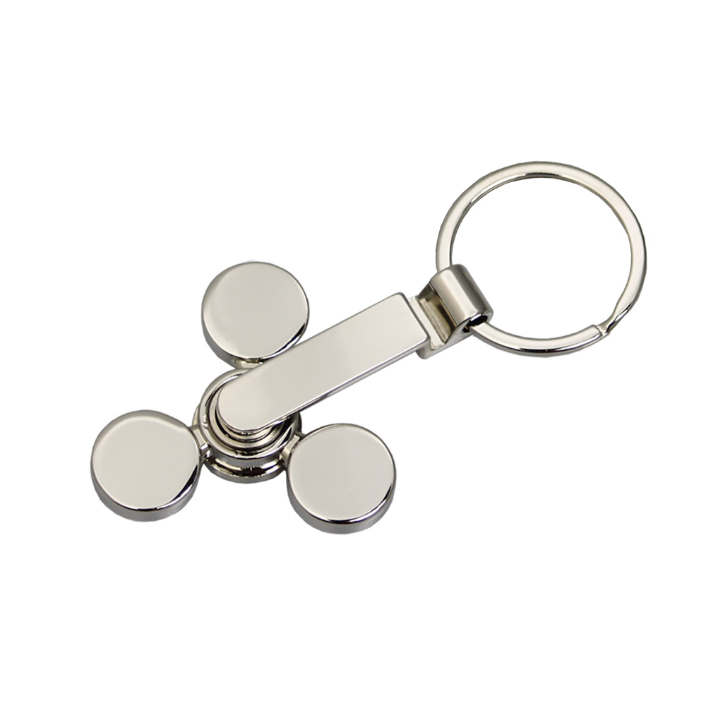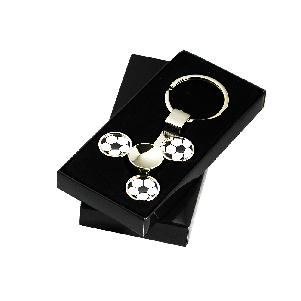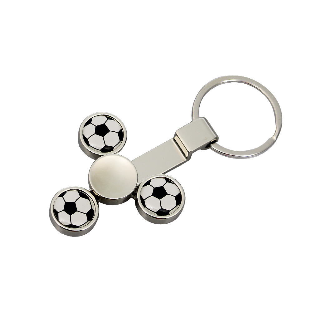 Metalowy brelok do kluczy z trzema piłkami nożnymi osadzonymi na obrotowym elemencie typu spinner.