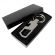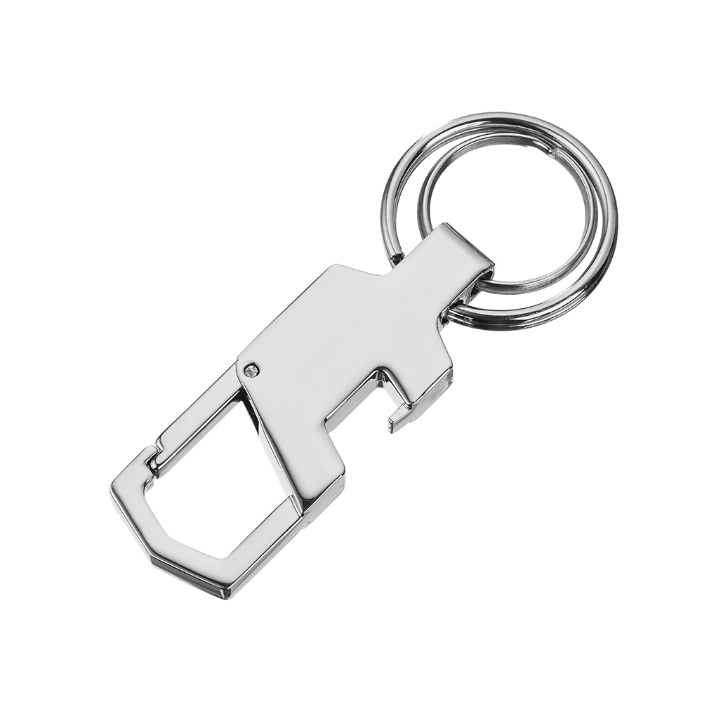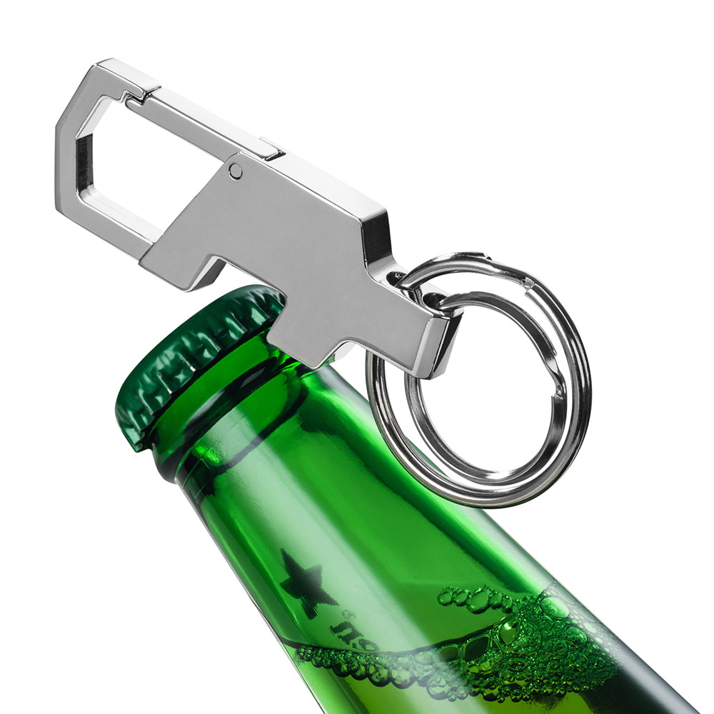 Metalowy brelok-otwieracz do butelek w kształcie karabińczyka z możliwością graweru z obu stron.