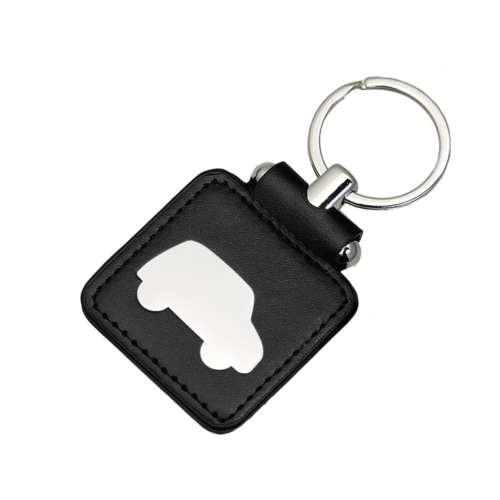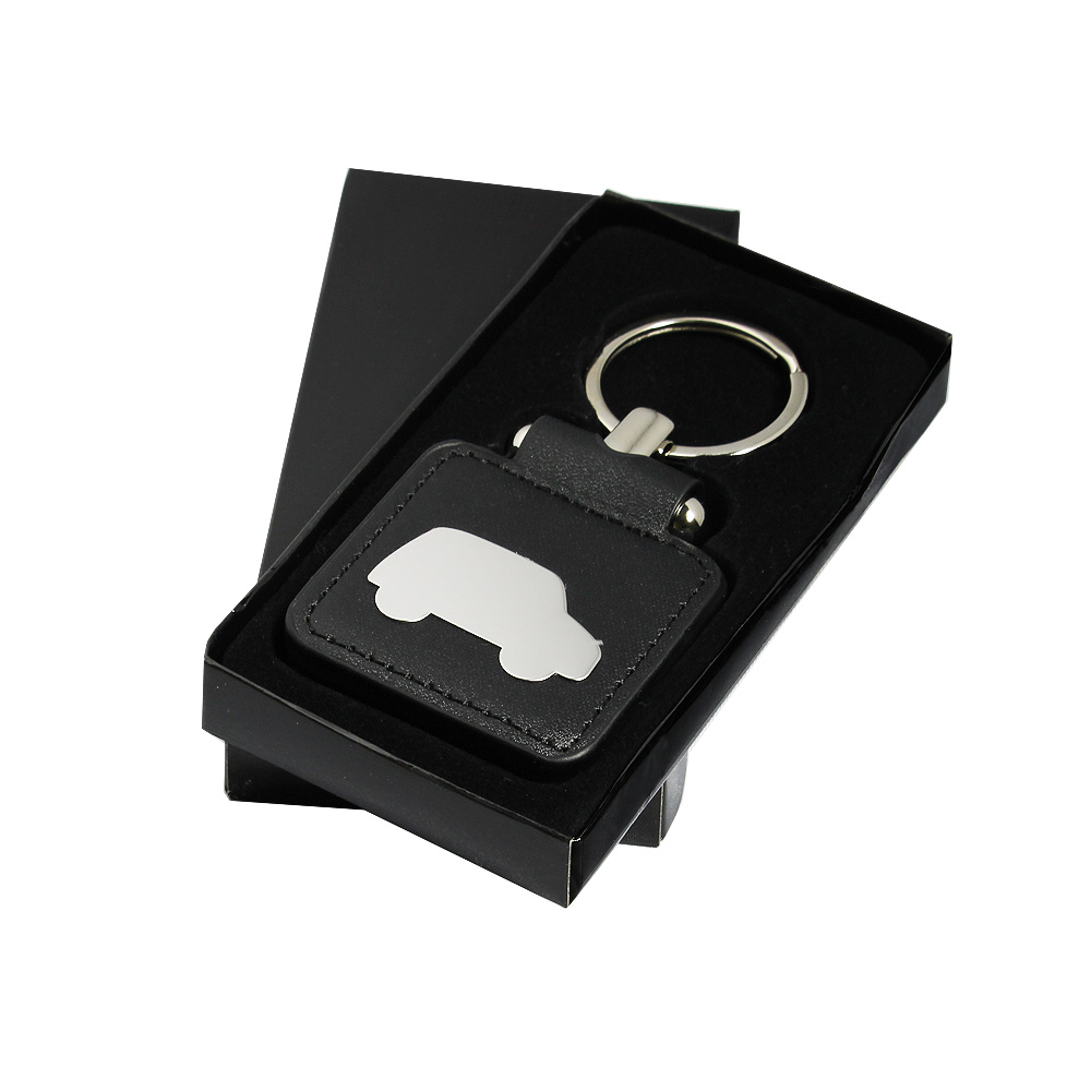 Metalowo-skóropodobny brelok do kluczy w kształcie kwadratowej przywieszki z emblematem w kształcie autka.