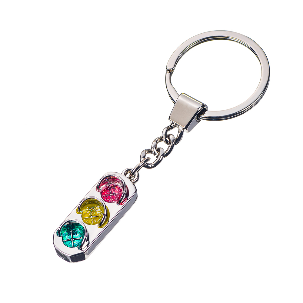 Brelok metalowy w kształcie sygnalizatora ulicznego z możliwością graweru na odwrocie.