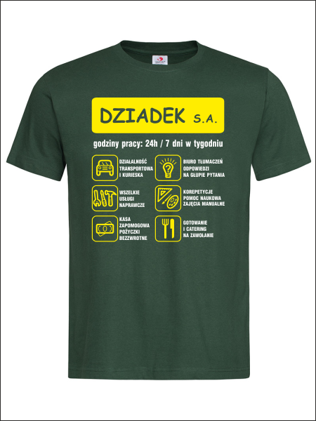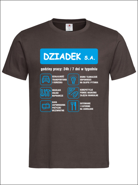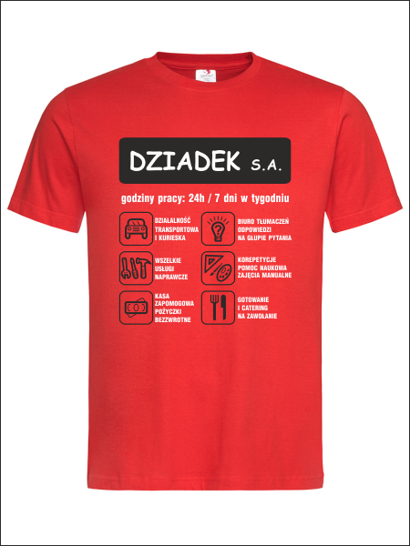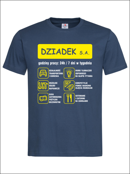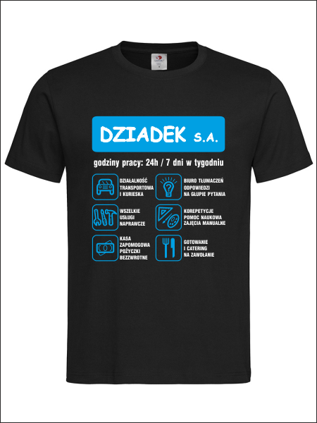 Na przodzie koszulki wykonany jest nadruk piktogramów i żartobliwej dedykacji dla Dziadka - "Dziadek SA".