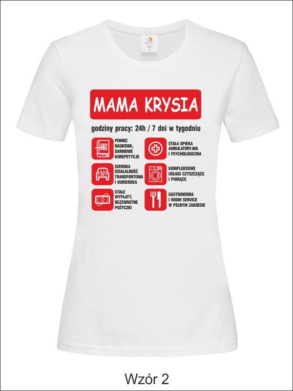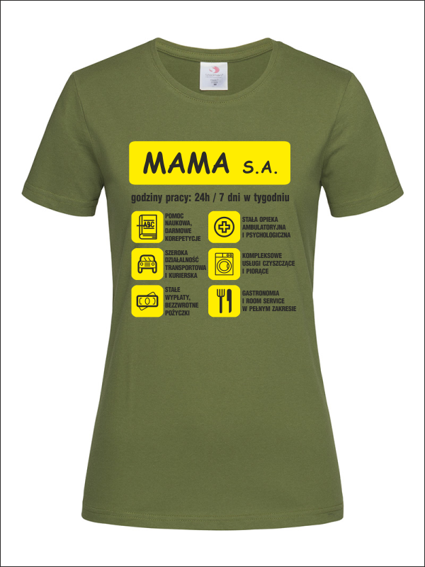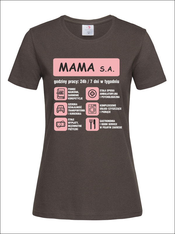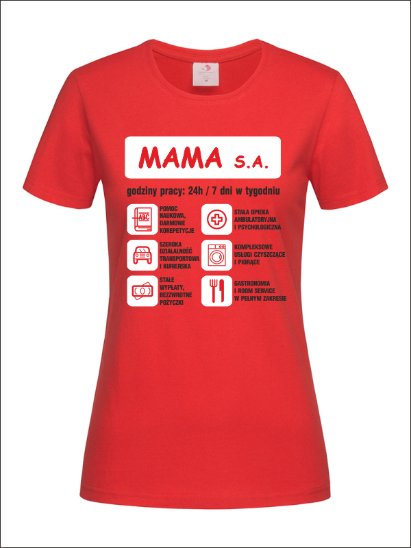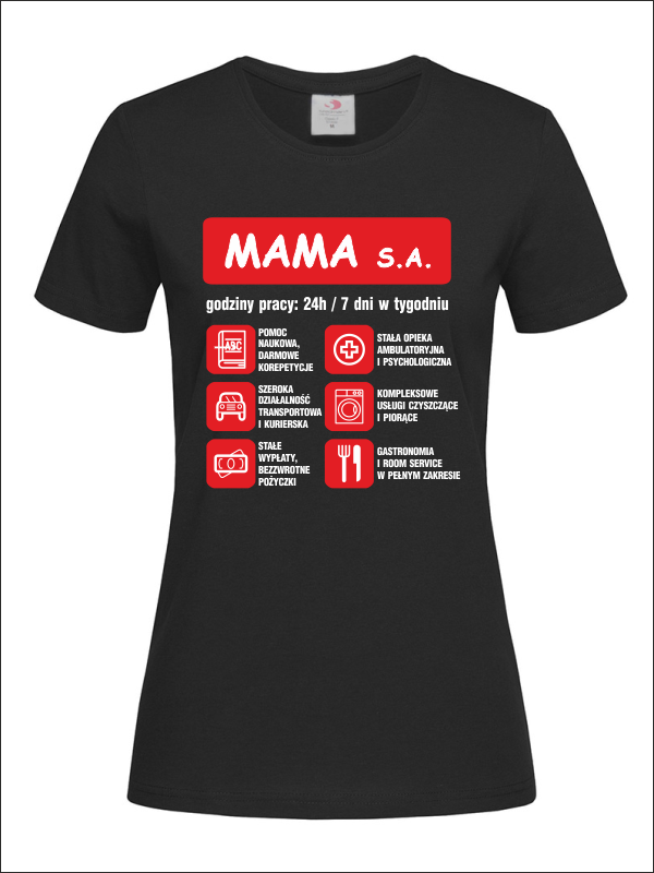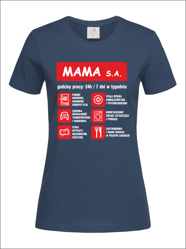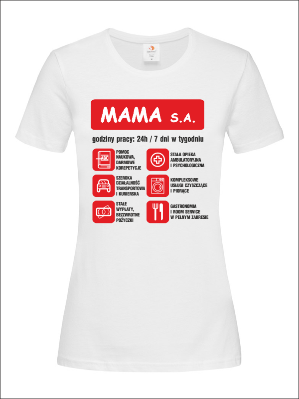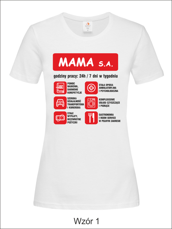 Na przodzie koszulki wykonany jest nadruk piktogramów i żartobliwej dedykacji dla Mamy - "Mama SA".