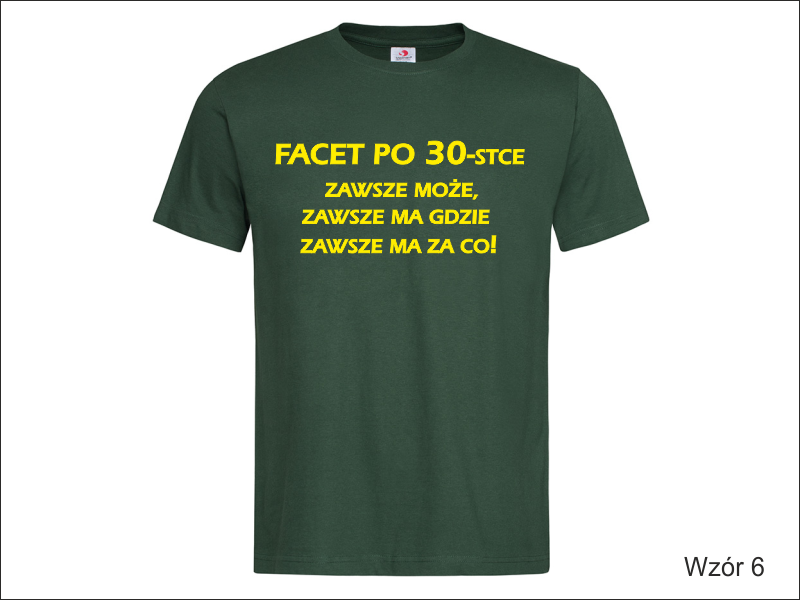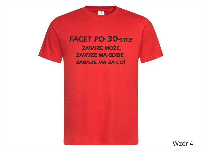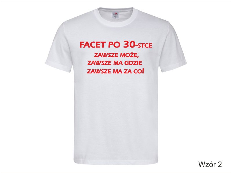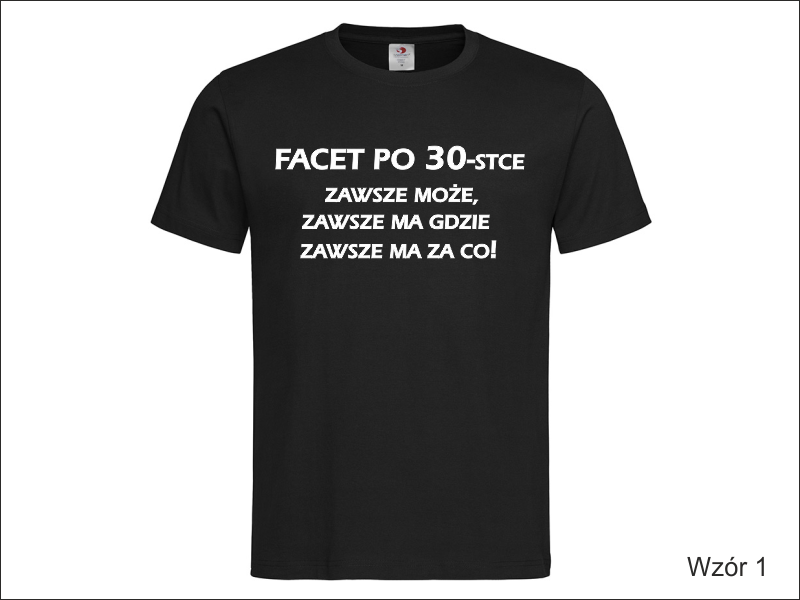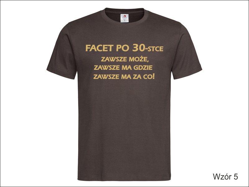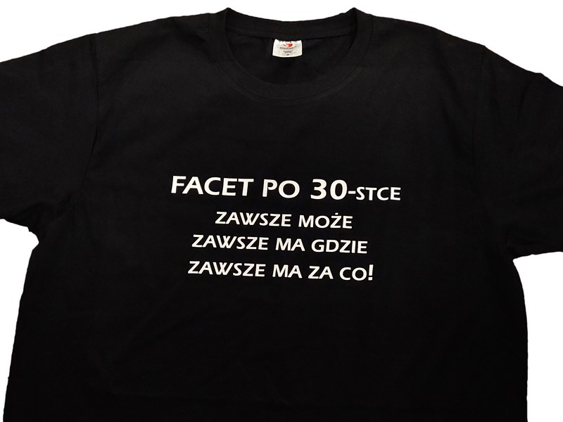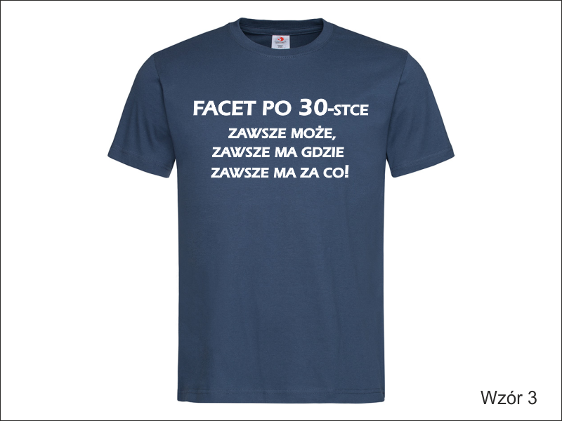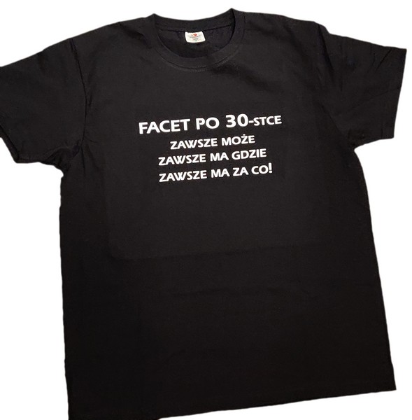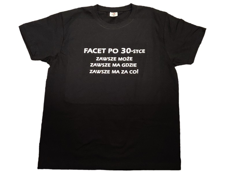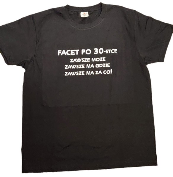 Urodzinowa koszulka męska z nadrukowaną z przodu grafiką i napisem "Facet po... zawsze może, zawsze ma gdzie, zawsze ma za co".