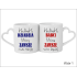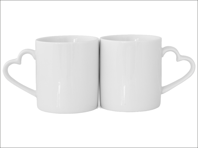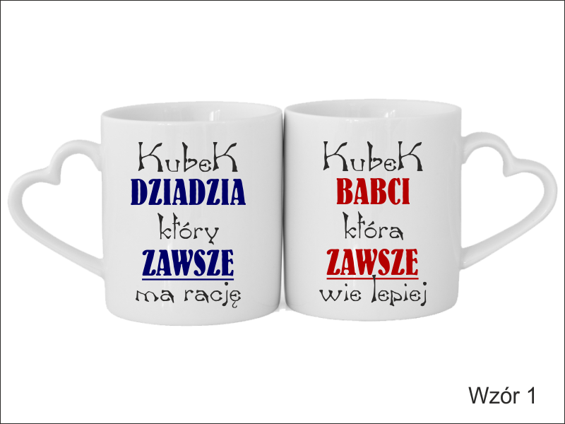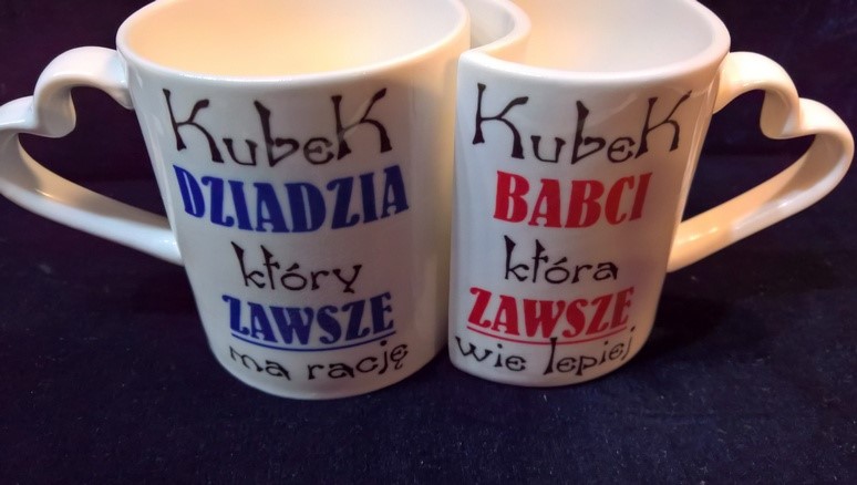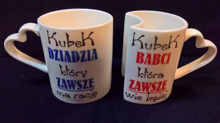 Upominek dla Babci i Dziadka w postaci kompletu kubeczków Amor Duo z uchwytem w kształcie serca, z nadrukiem.