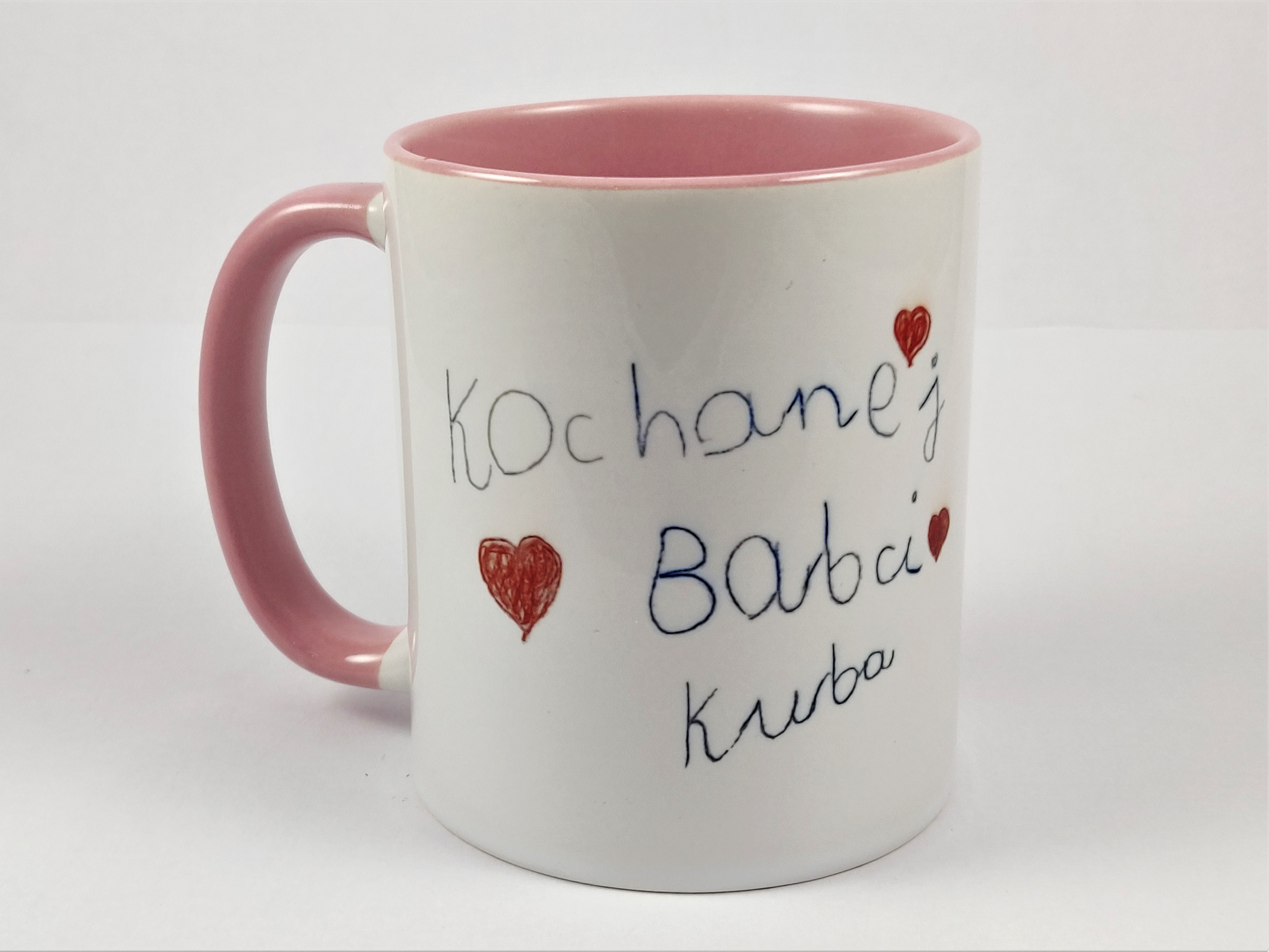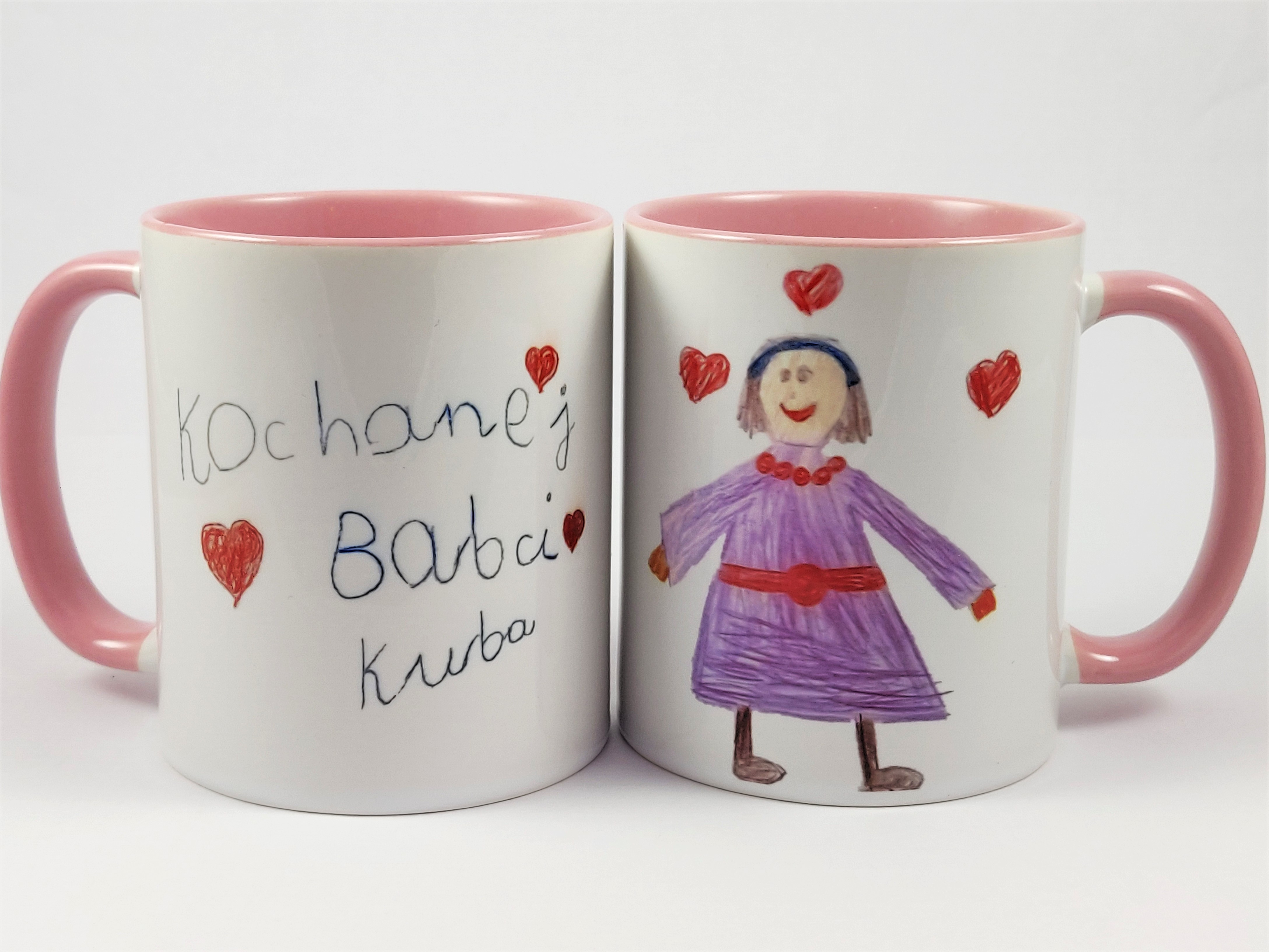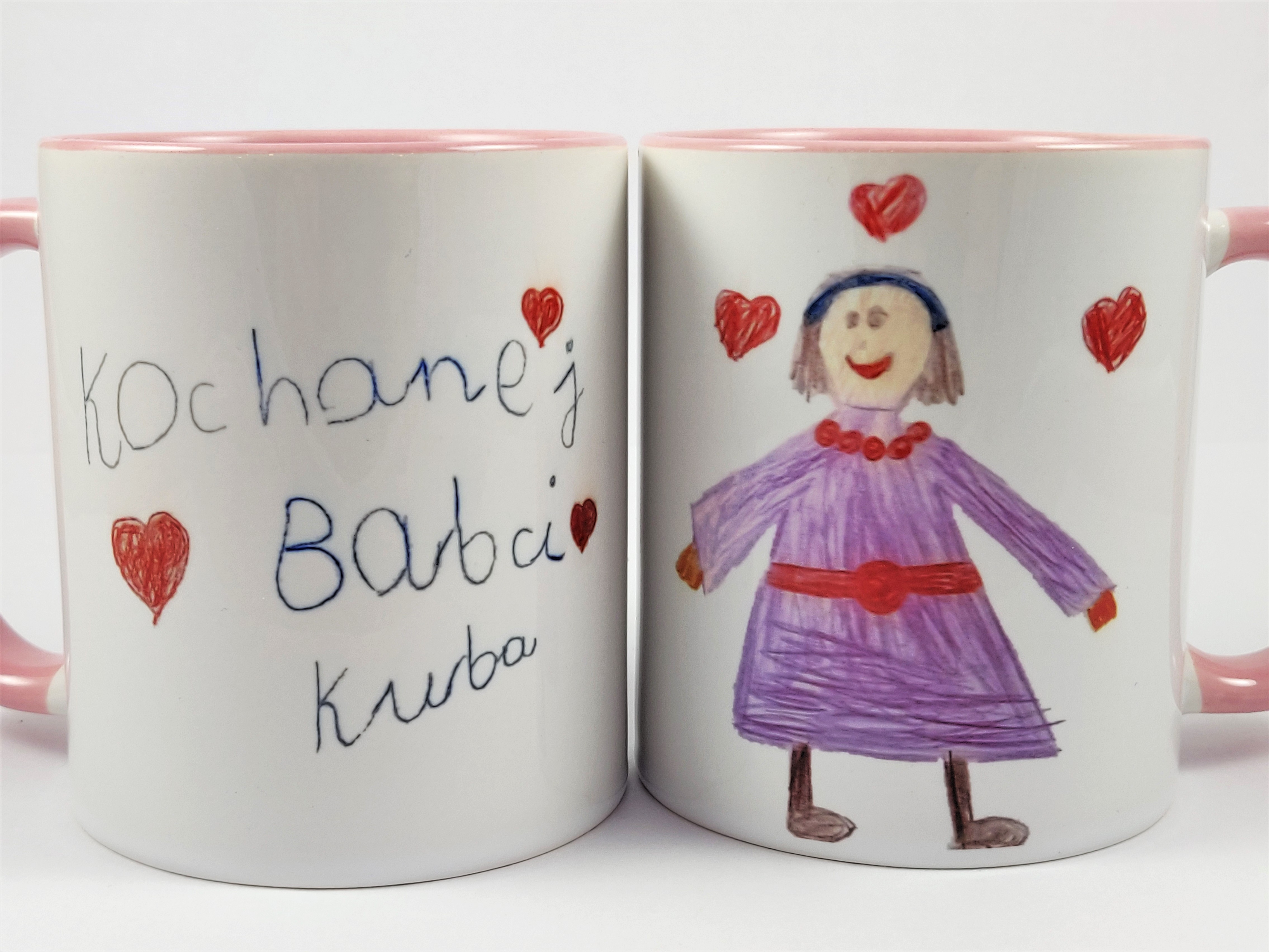 Wyjątkowy, niepowtarzalny upominek dla Babci lub Dziadka w postaci kubka z nadrukiem indywidualnego, odręcznego rysunku dziecka.