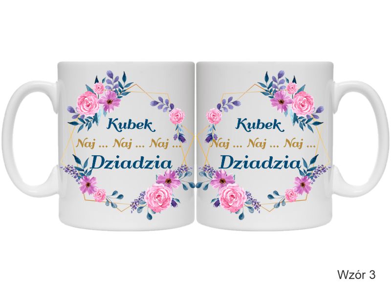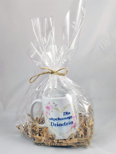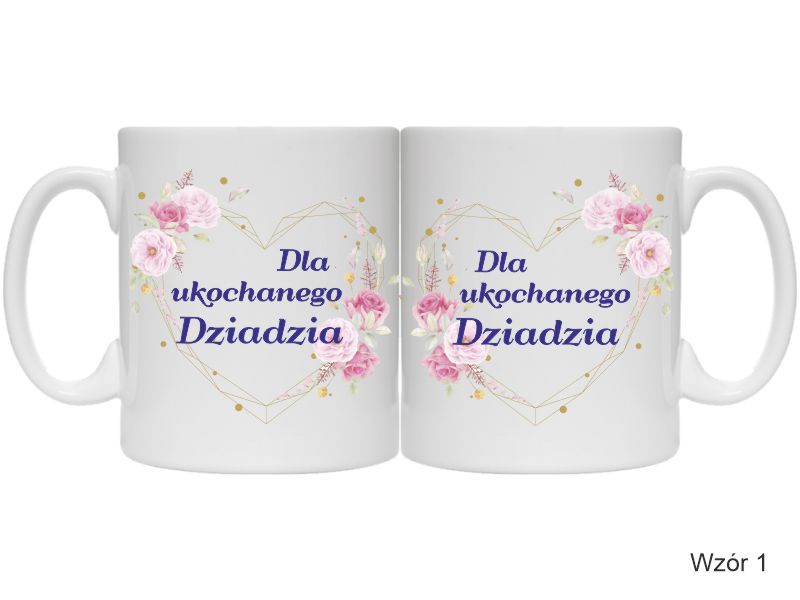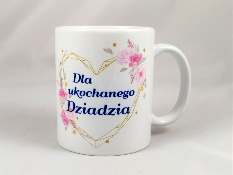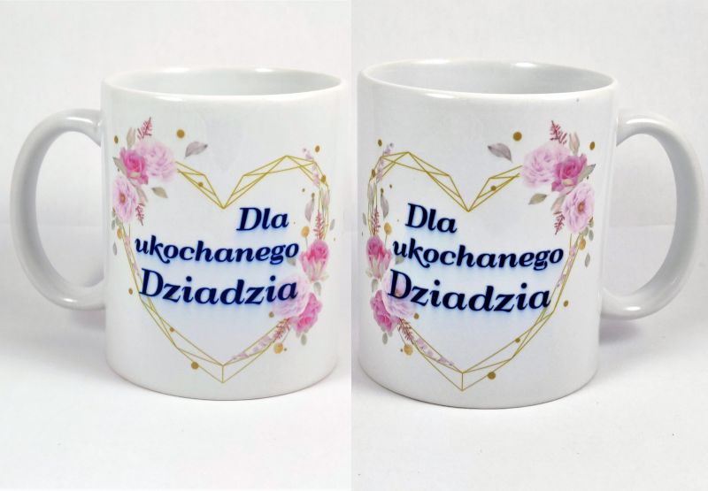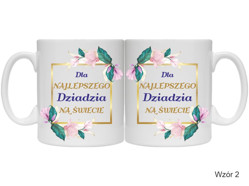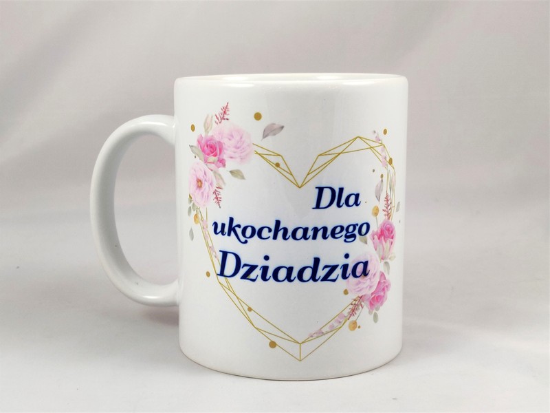 Upominek dla Dziadka w formie białego ceramicznego kubka z nadrukiem dedykacji w kwiatowej ramce.
