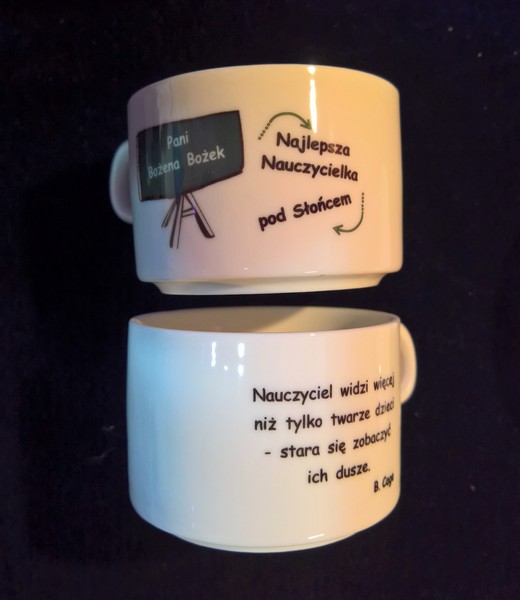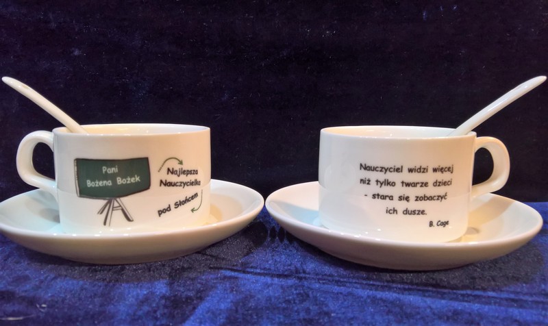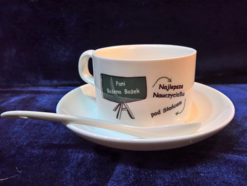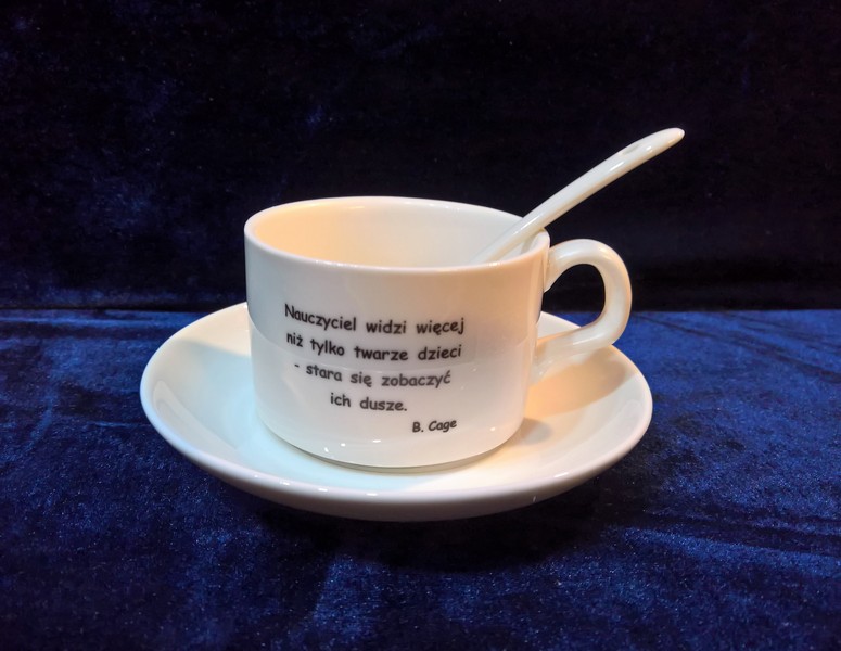 Na filiżance można wykonać pełnokolorowy nadruk sentencji, grafik lub zdjęcia z dedykacją dla Nauczyciela.