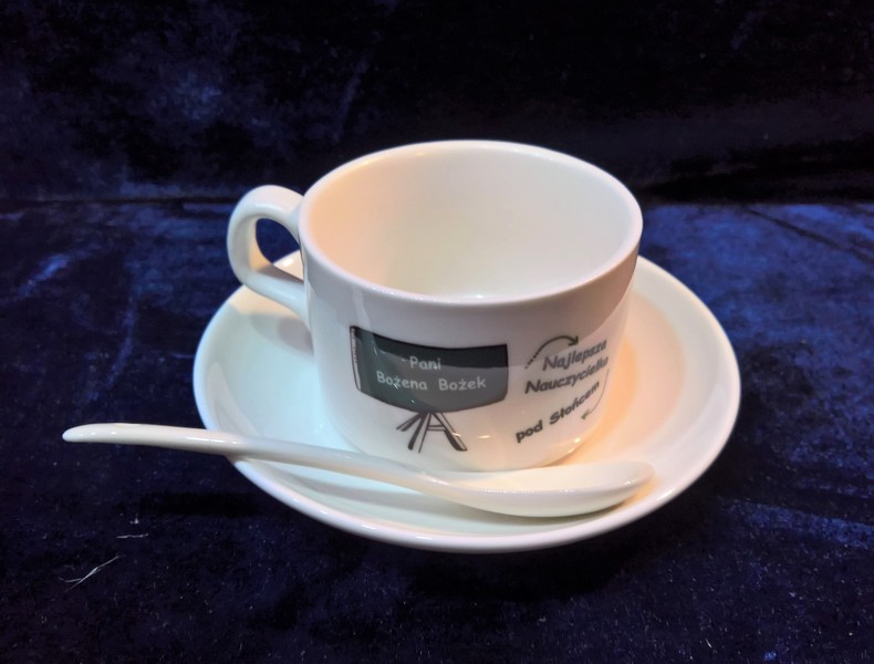 Propozycja na upominek dla Nauczyciela w postaci białej filiżanki w komplecie ze spodkiem i łyżeczką, z dedykowanym nadrukiem.