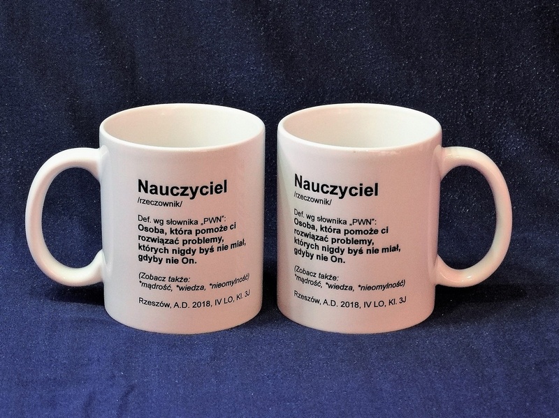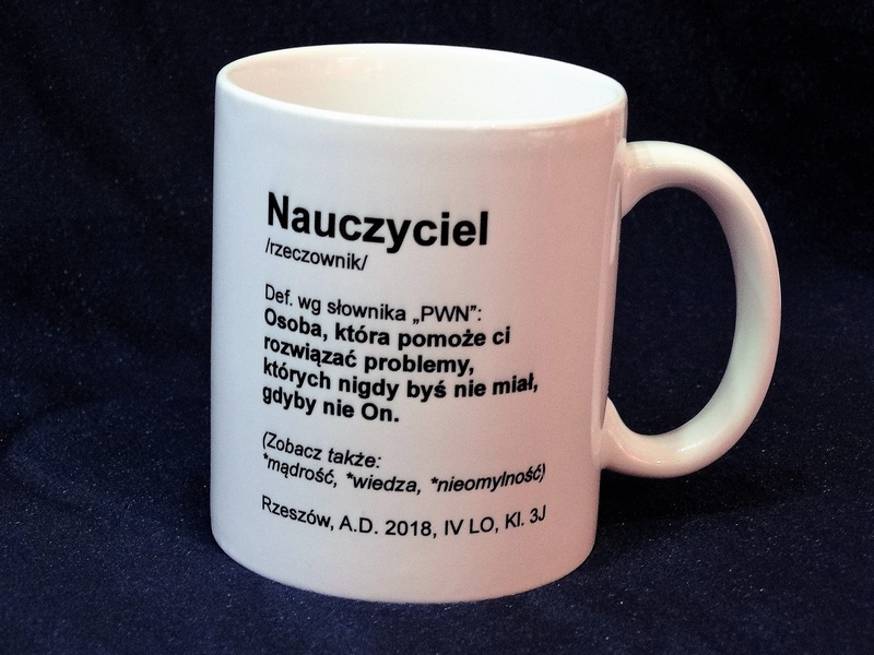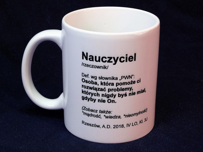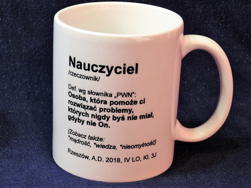 Na kubku można wykonać pełnokolorowy nadruk dedykacji, grafik lub zdjęcia dla Nauczyciela.