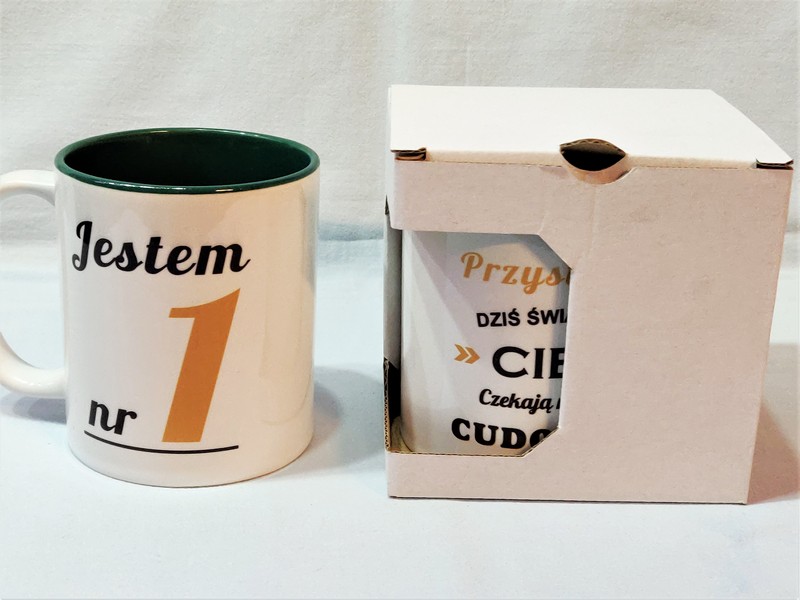 Na kubku wykonny jest pełnokolorowy nadruk pamiątkowej dedykacji "Jestem(ś) nr 1".