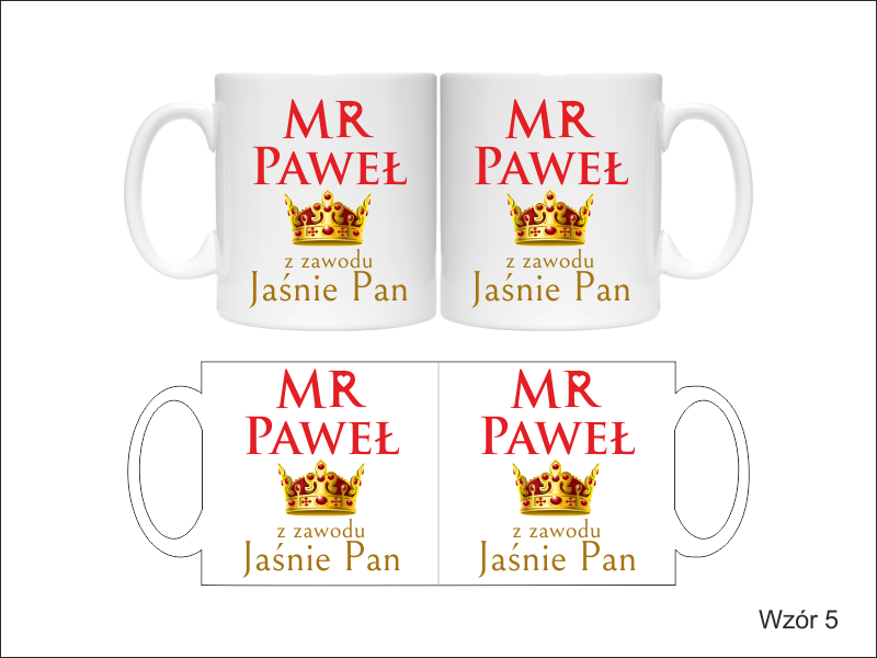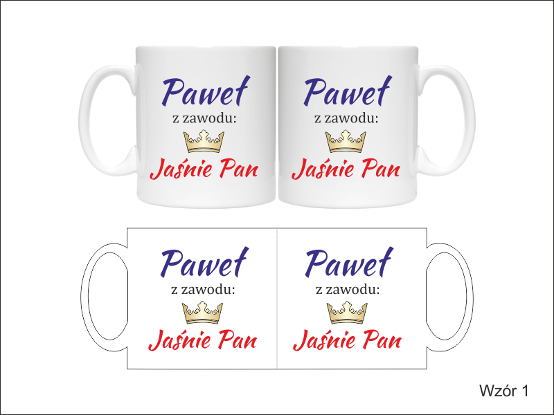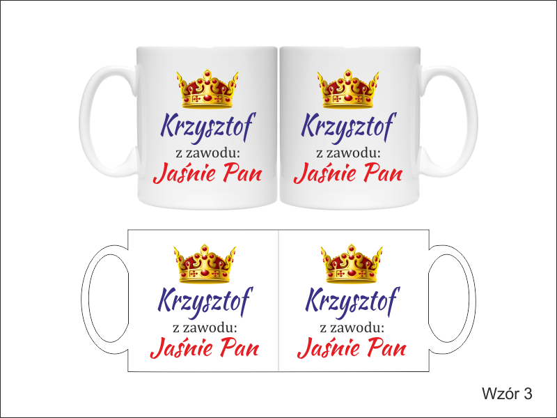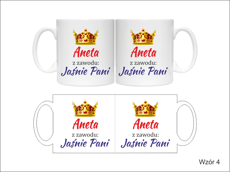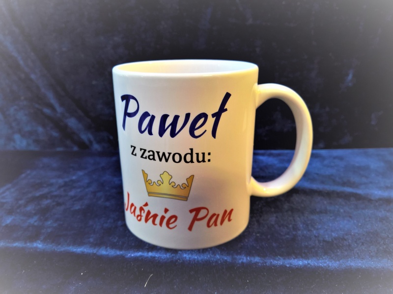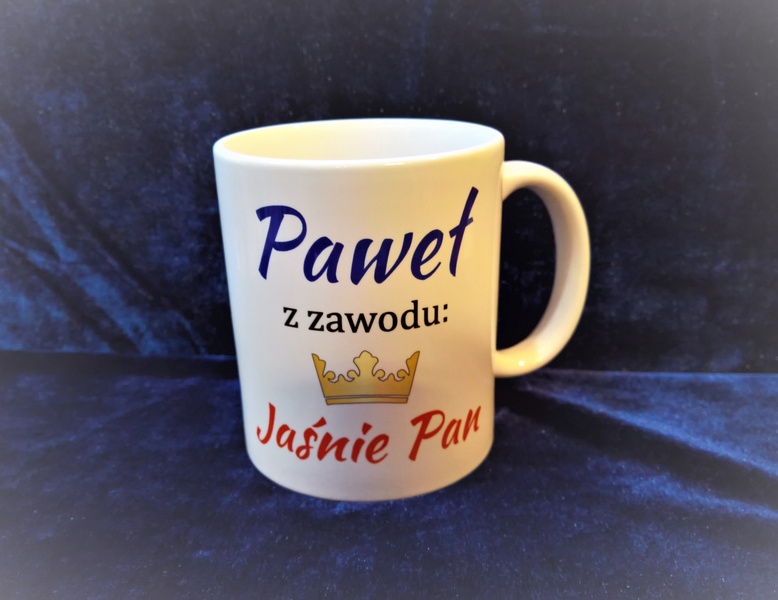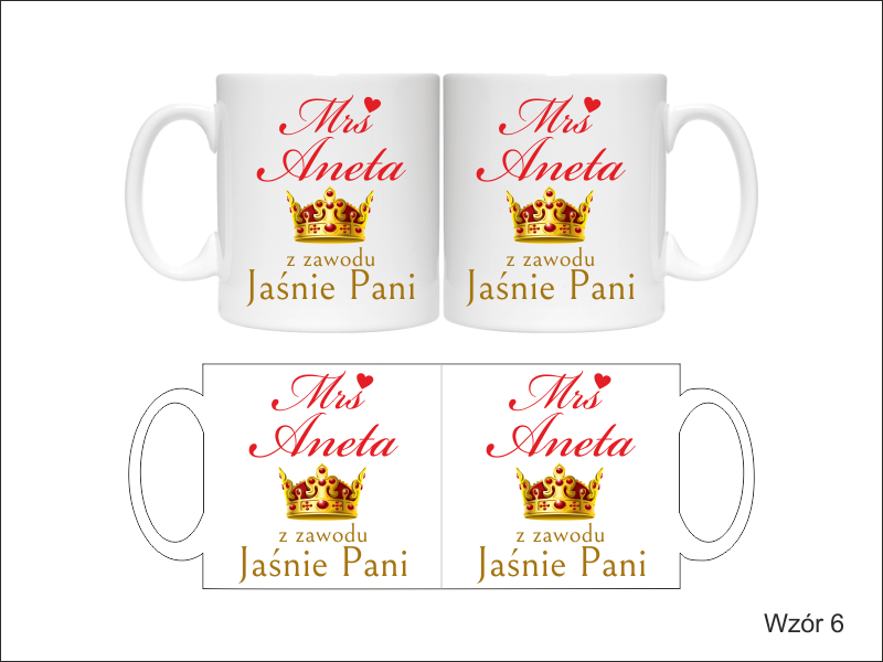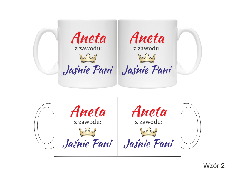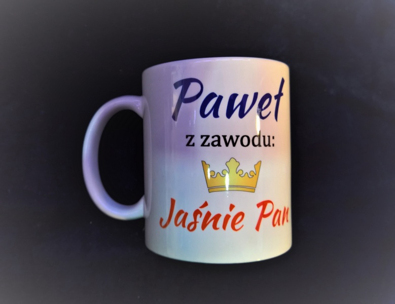 Na kubku wykonny jest pełnokolorowy nadruk pamiątkowej dedykacji "Jaśnie Pani" - dla Niej lub "Jaśnie Pan" - dla Niego.
