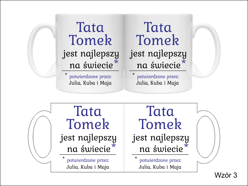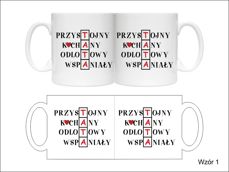 Nadruk dedykacji na kubku jest dowolny i można wykorzystać jeden z wzorów lub wykonać wg indywidualnych ustaleń.