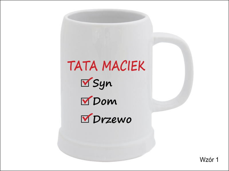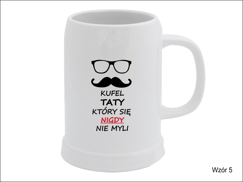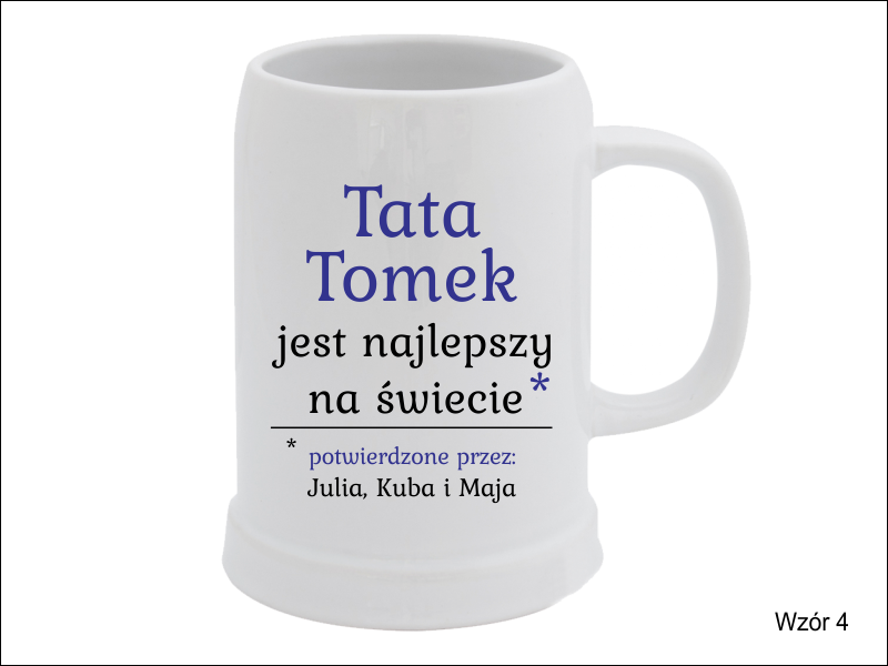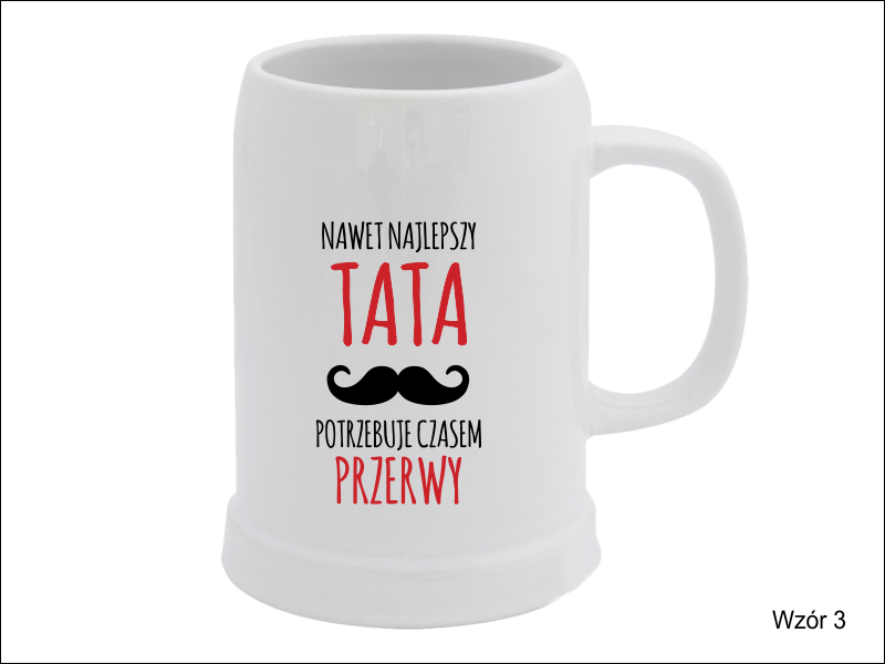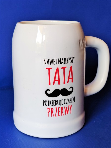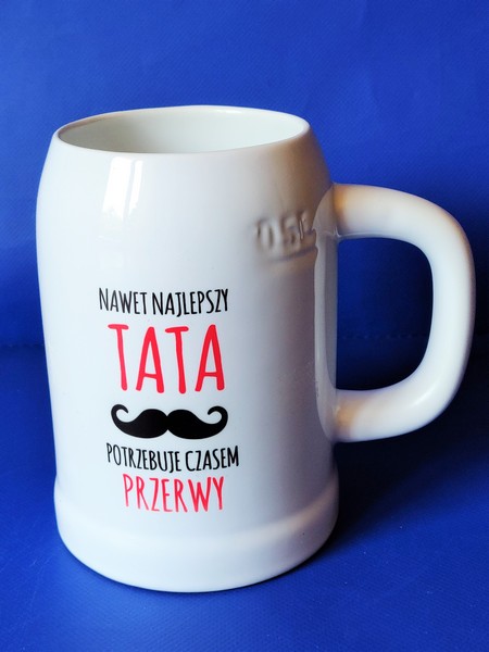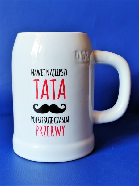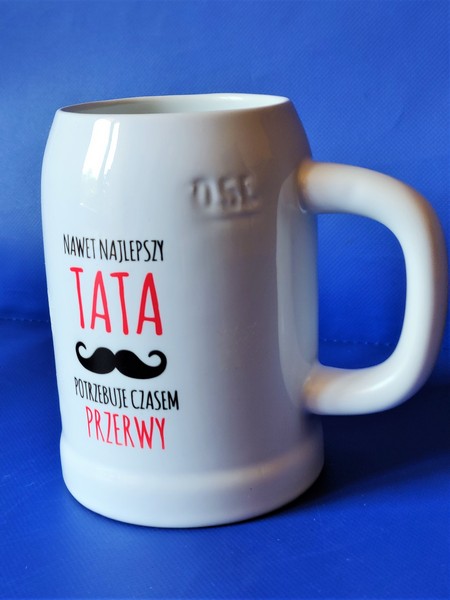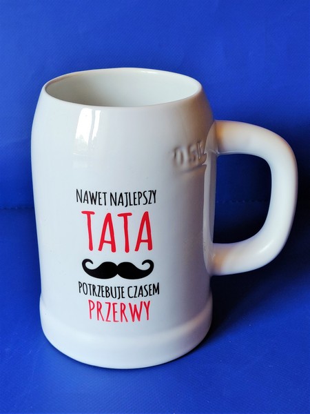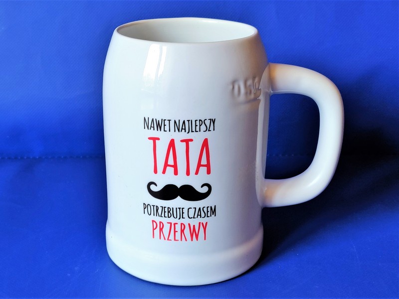 Upominek dla Taty w postaci ceramicznego kufla do piwa z nadrukiem.