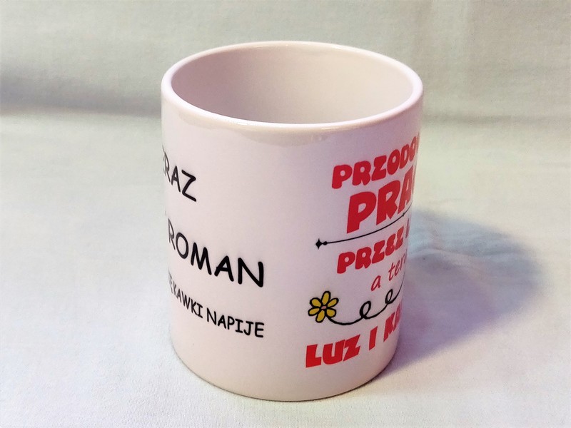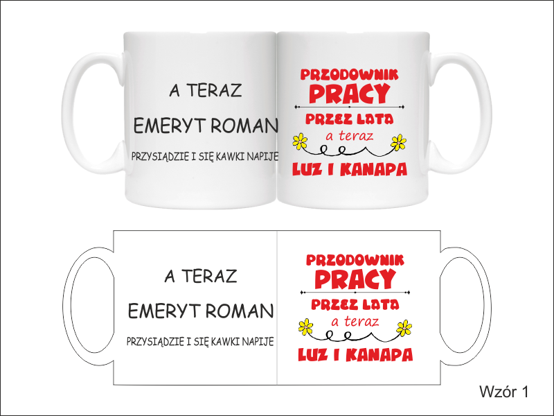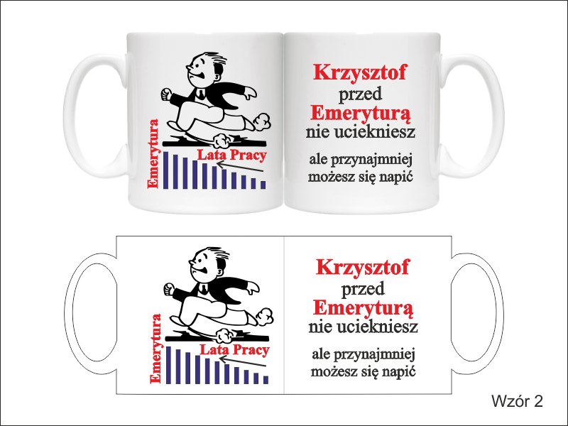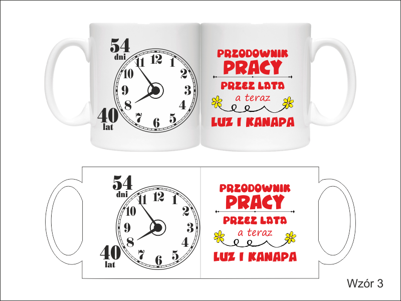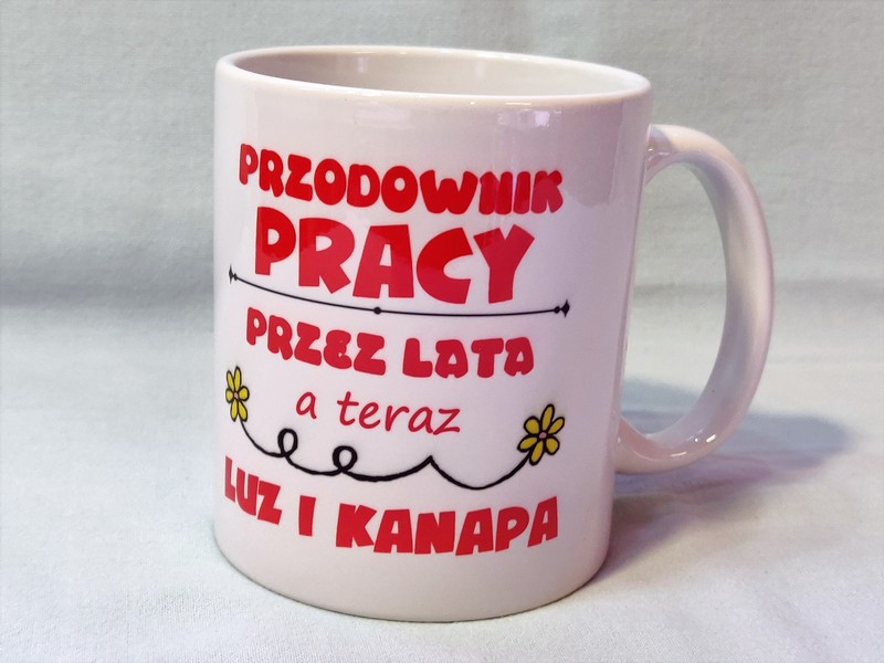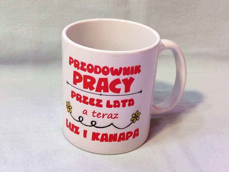 Na kubku wykonany jest pełnokolorowy nadruk pamiątkowej dedykacji z okazji zakończenia pracy i przejścia na emeryturę.