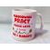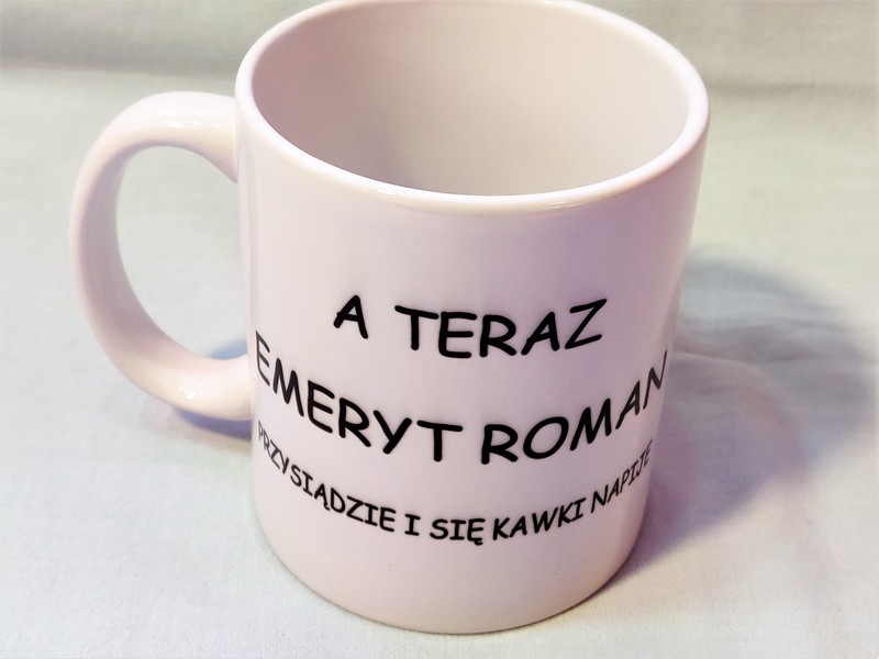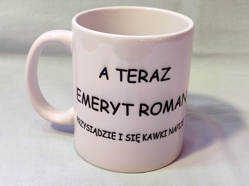 Upominek dla Emeryta w postaci białego kubka z nadrukiem.