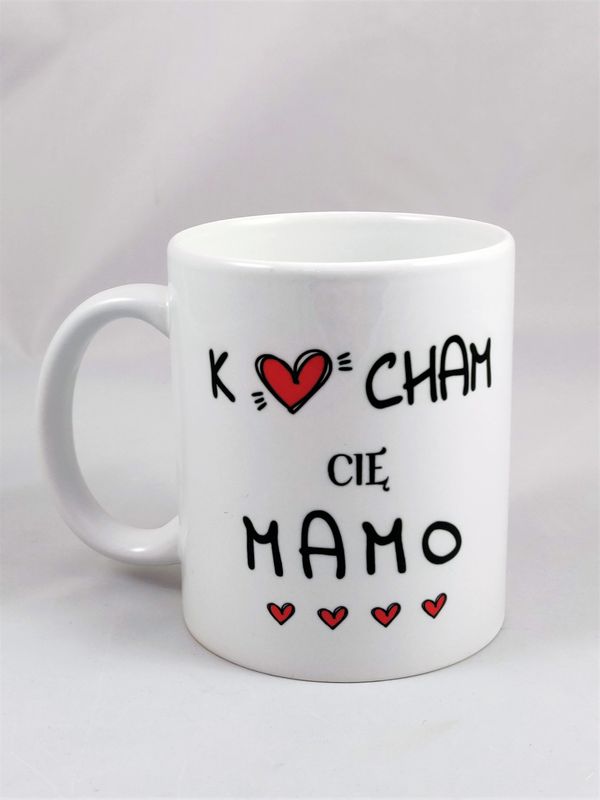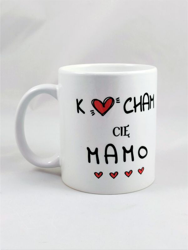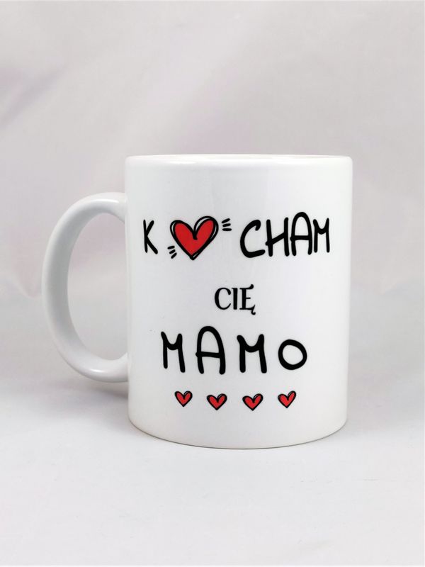 Upominek dla Mamy w postaci białego kubka z nadrukiem okolicznościowej dedykacji.