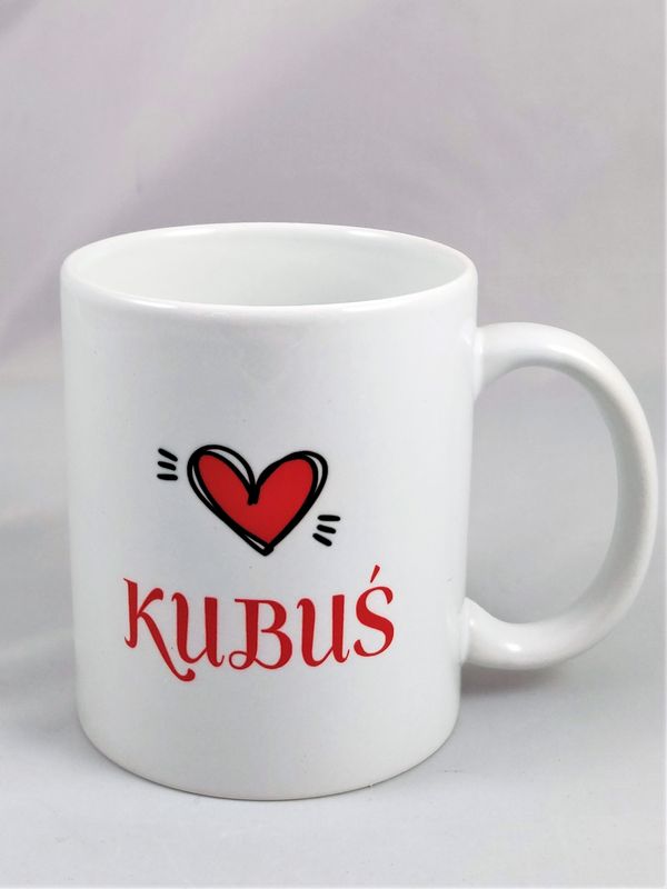 Nadruk na kubku z dedykacją "Kocham Cię Mamo" oraz imieniem dziecka wykonany jest po obu stronach kubeczka.