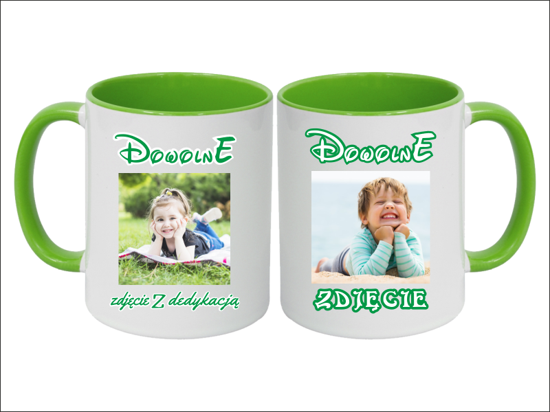 Kubek biały z zielonym uszkiem i wnętrzem z nadrukiem