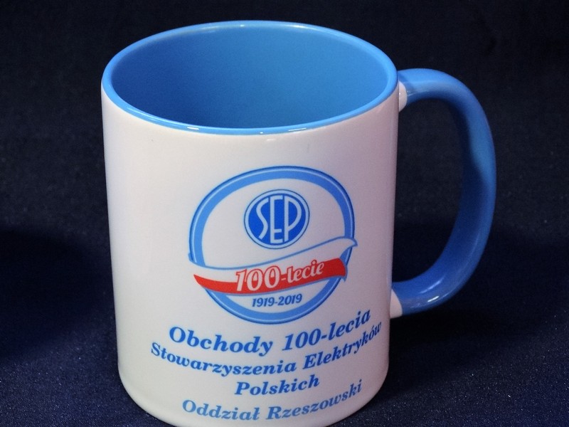 Pamiątka Jubileuszu Firmy czy Stowarzyszenia w postaci białego kubka z kolorowym wnętrzem z nadrukiem.