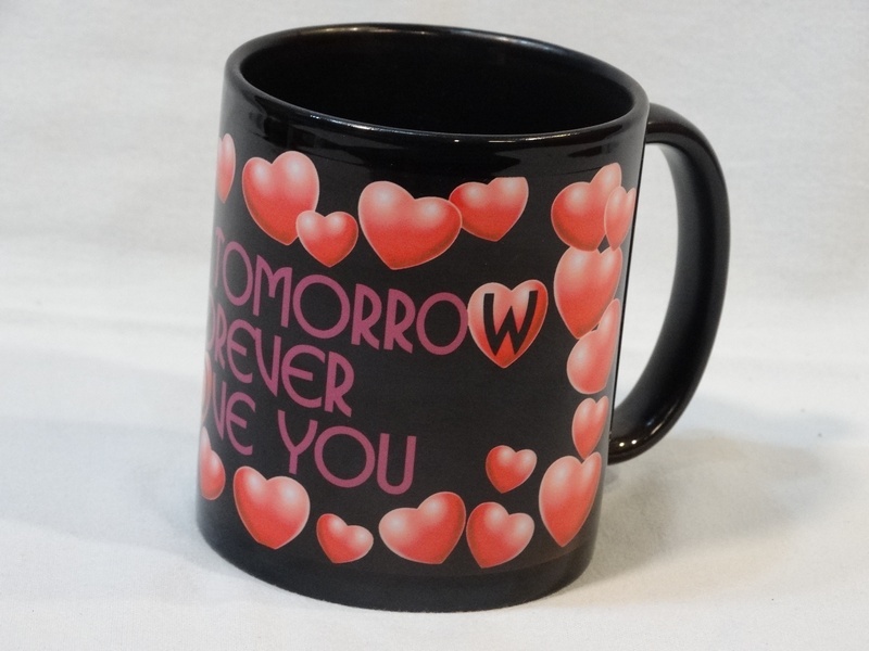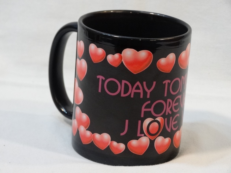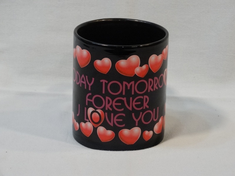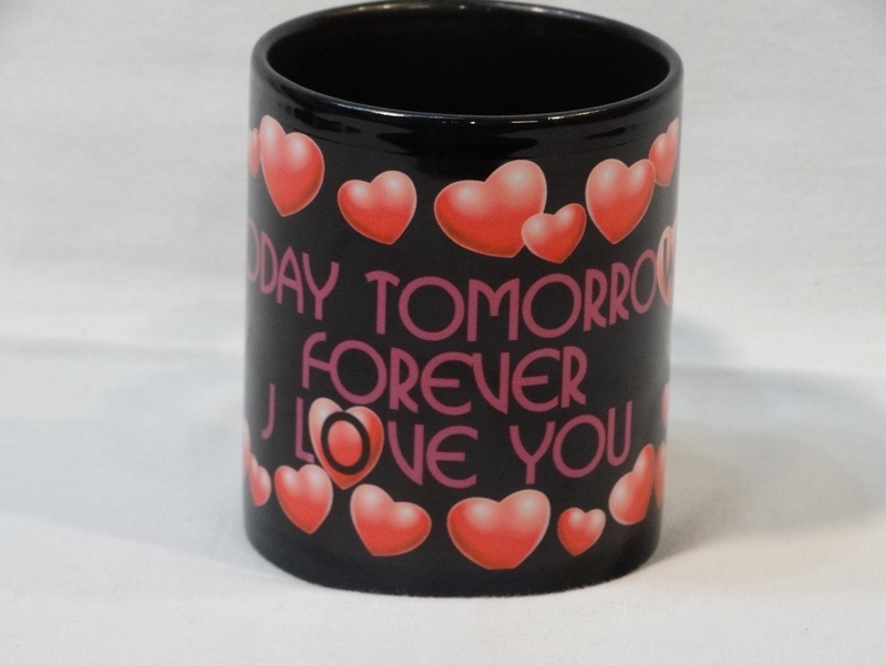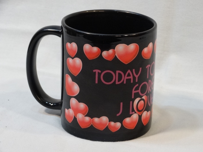 Propozycja na upominek dla zakochanych w postaci czarnego kubka z okienkiem do nadruku.