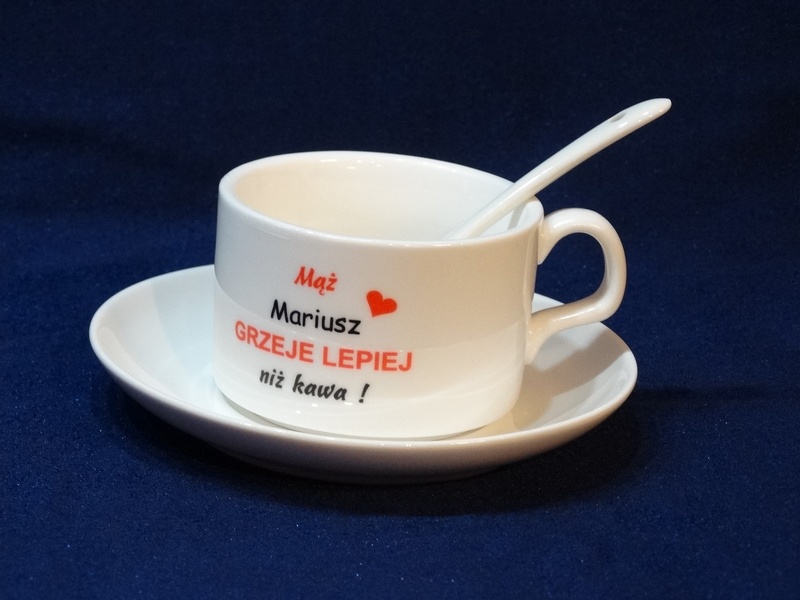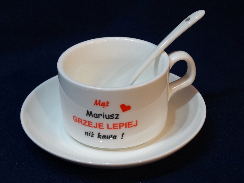 Propozycja na upominek dla zakochanych małżonków w postaci białej filiżanki ze spodkiem i łyżeczką, z nadrukiem.