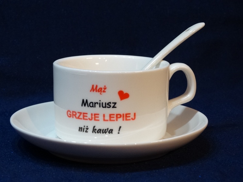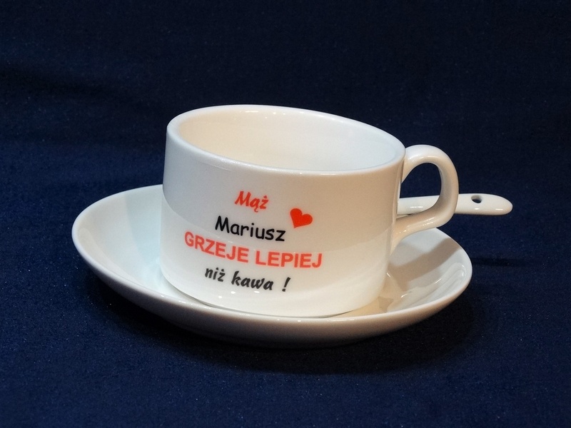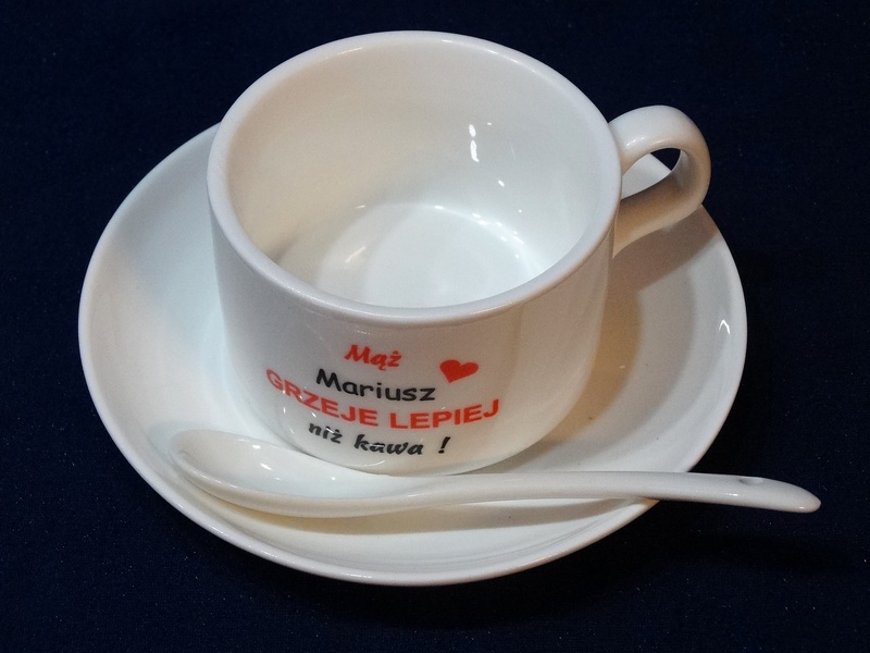 Na filiżance można wykonać pełnokolorowy nadruk dedykacji, grafik lub zdjęcia dla Żony lub Mężą.