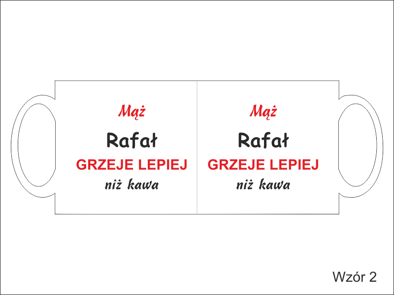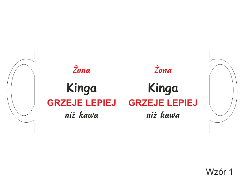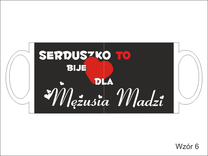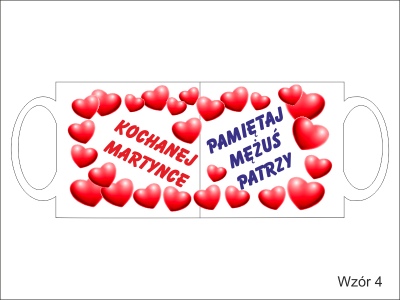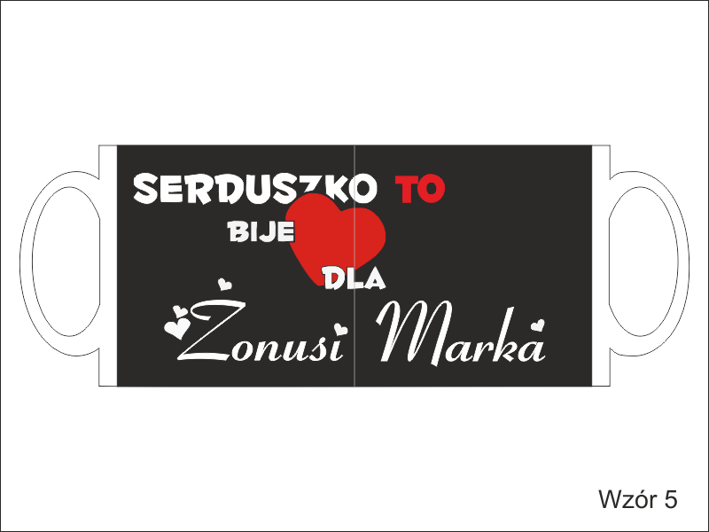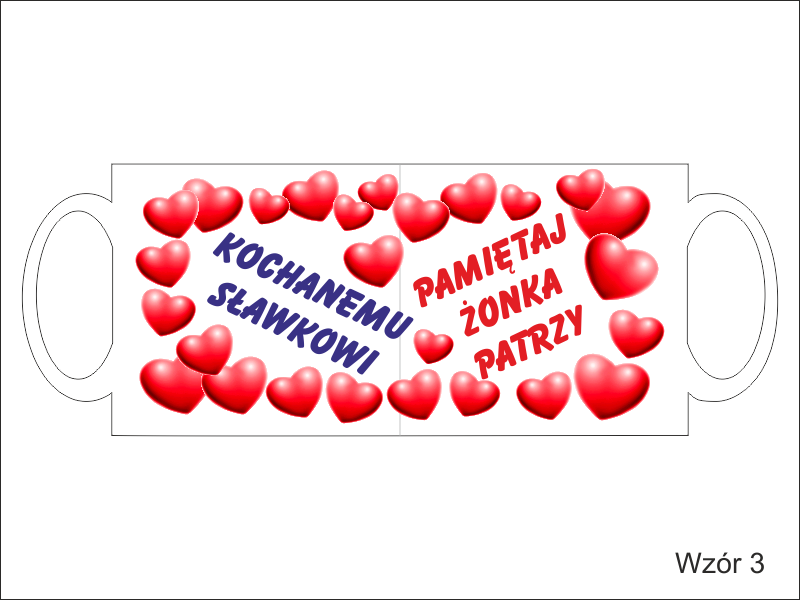 Nadruk dedykacji na kubku jest dowolny i można wykorzystać jeden z wzorów lub wykonać wg indywidualnych ustaleń.