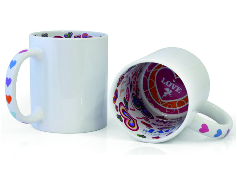 Powierzchnia kubka pokryta jest specjalną, przyjmującą nadruk powłoką, dodatkowo utwardzoną, co zapewnia odporność na mycie w zmywarce.