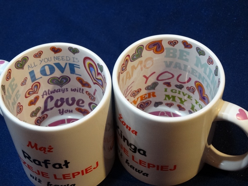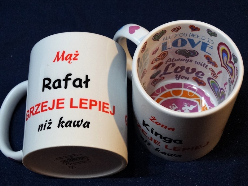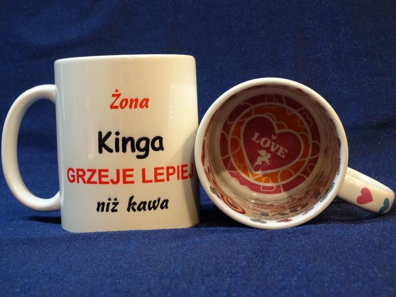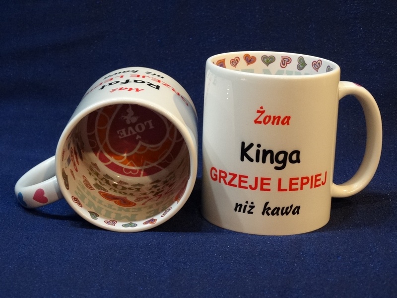 Na kubku można wykonać pełnokolorowy nadruk dedykacji, grafik lub zdjęcia dla Żony lub Mężą.