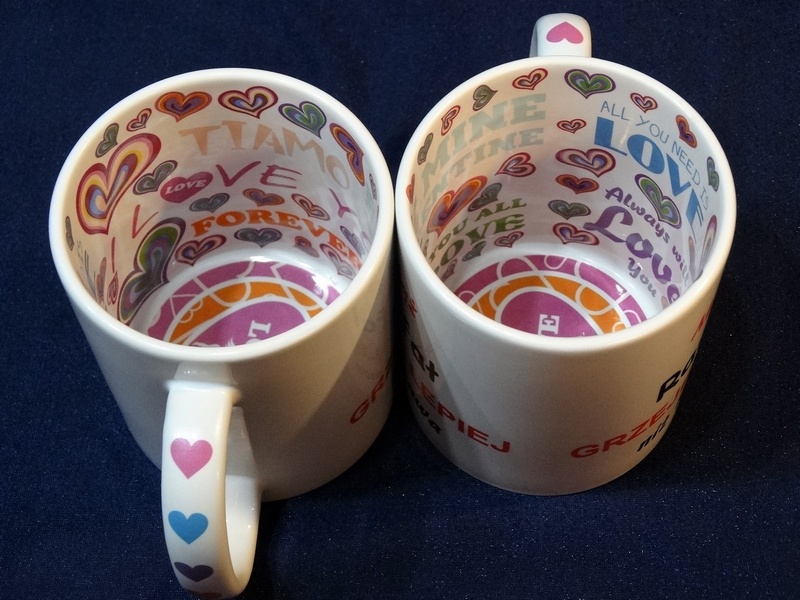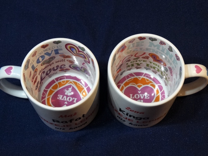 Propozycja na upominek dla zakochanych małżonków w postaci białego kubka z wnętrzem LOVE, z nadrukiem na zewnątrz.