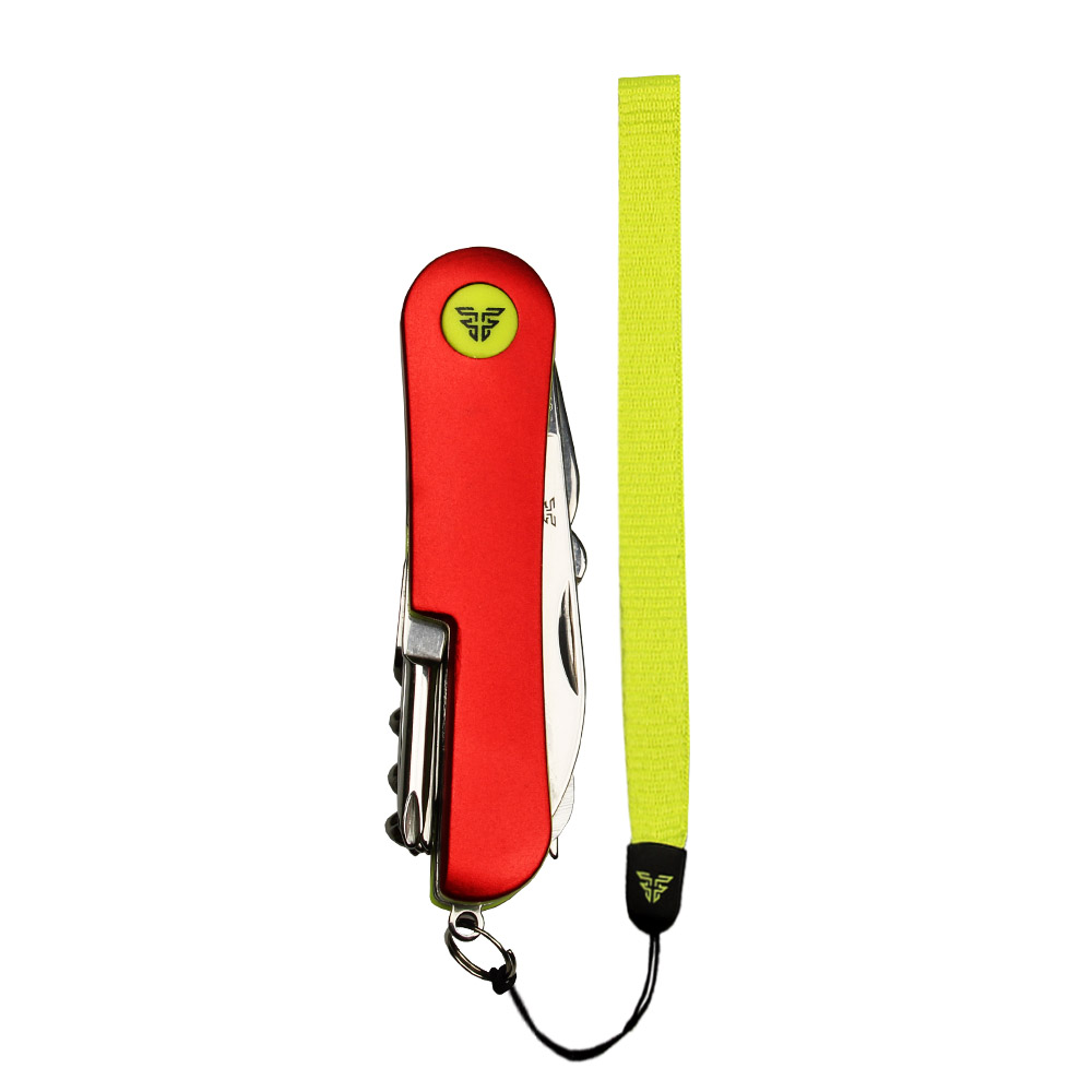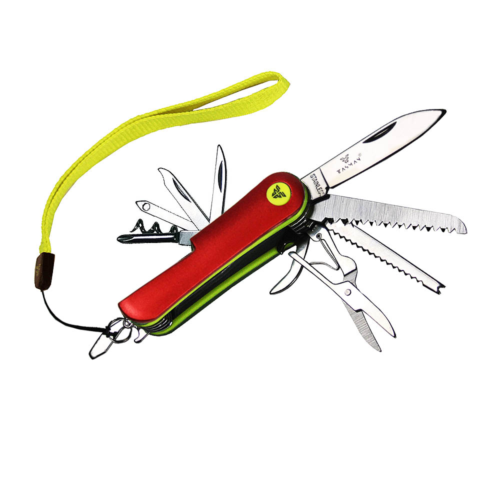 Złożony scyzoryk ma wielkość 9 cm. Scyzoryk ma 11 funkcji i dodatkową smycz.